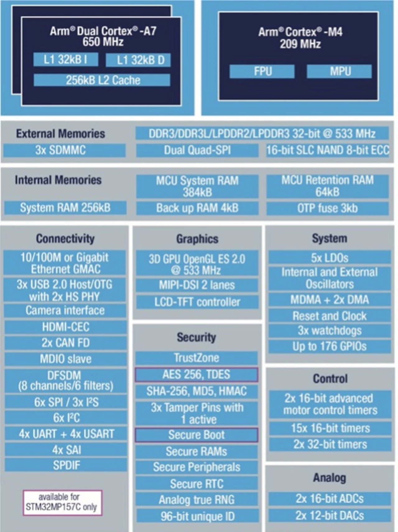 The i.MX 8 also integrates a Tensilica HiFi 4 DSP for audio pre and post processing, which is clocked at 640 MHz. An analogy for ST is missing. The CAAM (Cryptographic Accelerator and Assurance Module) of NXP implements various encryption and hashing functions, a runtime integrity tester and a pseudo random number generator (PRNG). CAAM also implements a secure memory mechanism. The memory provided for this is 64 KB.