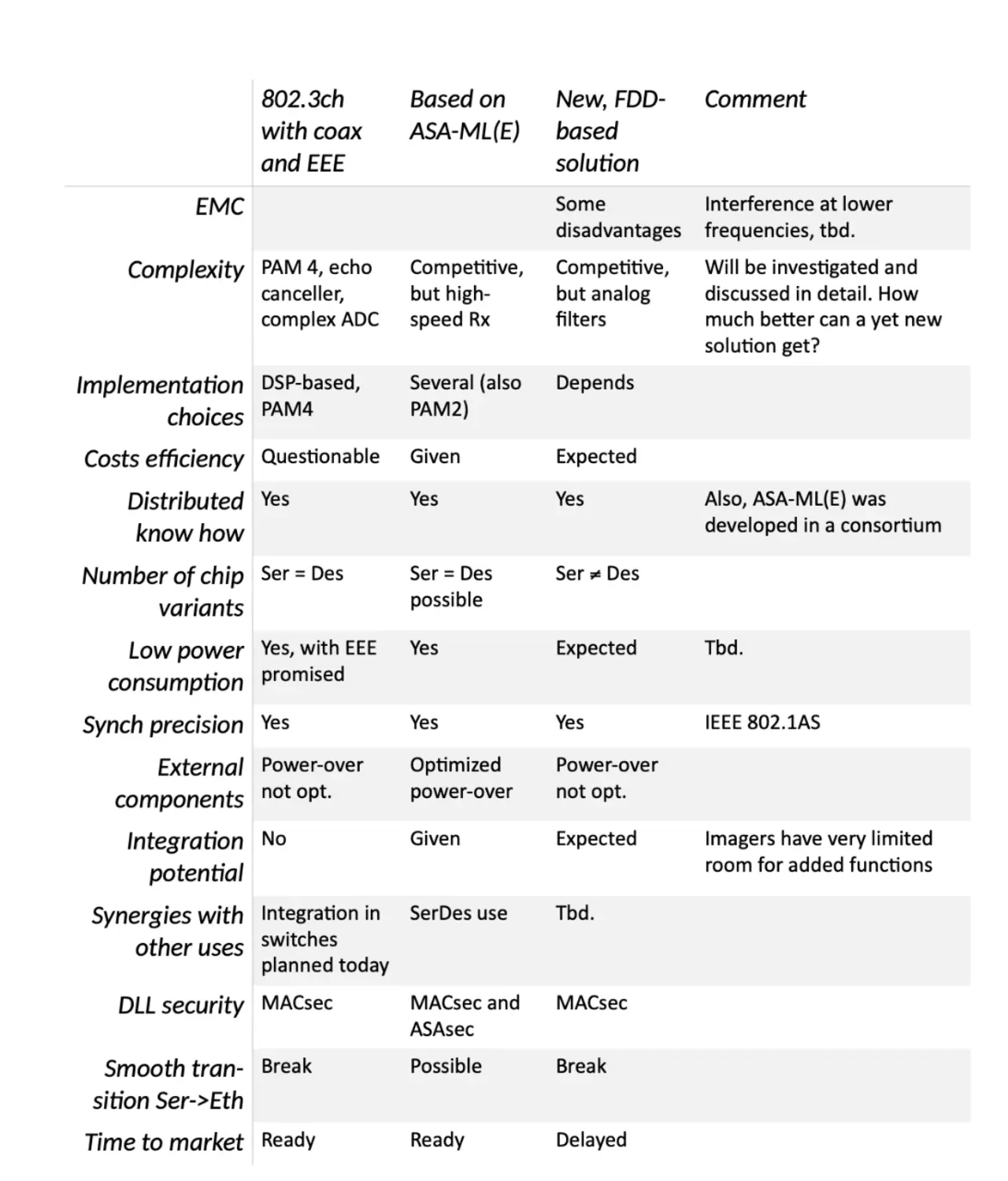 With the Option 4 not only requiring approval of the respective entity, but also giving a very (too?) large head start to the vendor dominating it, it seems an unlikely option. It is therefore not part of Table 1, which shows the results of a qualitative rating as seen by the author. As can be seen, in the authors opinion, adopting an ASA-ML(E)-based solution in the IEEE project is the most promising way forward, and most promising is what is needed to be successful in a substitution market situation. It is understood that consensus building, and technical proof is still necessary in the IEEE TF. However, Table 1 also emphasizes the importance to include also not-primarily technical items in the decision-making process. I invite everyone to join the process to move the industry forward. Unity is the way to reach the stars.