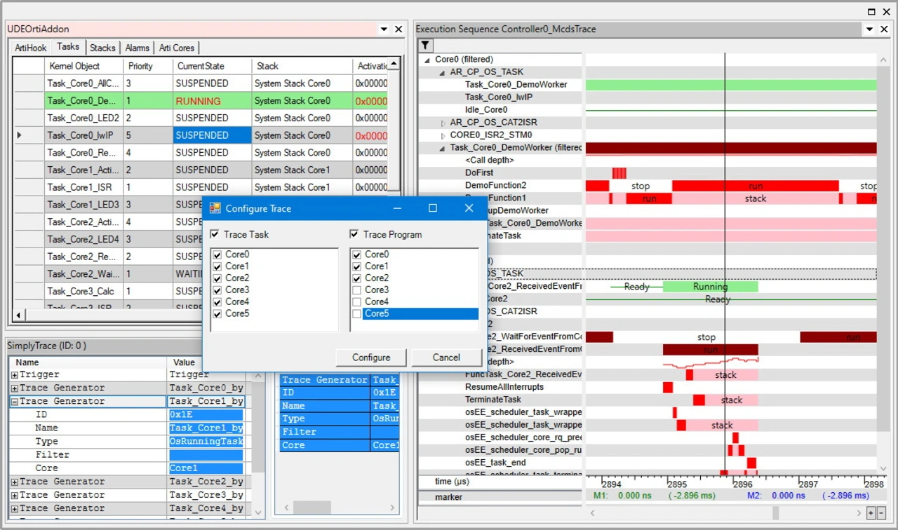 Thus, for example, the UDE SimplyTrace feature provides easy and particularly user-friendly access to the trace functionality of the microcontroller used. The most important components of this feature are convenient and easily accessible commands that can be used to configure the trace system for the respective debugging task in the shortest possible time. Since UDE SimplyTrace is also integrated into the RTOS Awareness in UDE 2024, a desired task trace can be generated quickly and efficiently to examine the timing behavior of applications under operating system controllers. Besides real-time operating systems like SAFERTOS, FreeRTOS, PXROS-HR or MicroC/OS-II, AUTOSAR are also supported. In addition, UDE SimplyTrace can now also be used for those controllers of the Infineon’s AURIX family, which only provide miniMCDS trace. miniMCDS, a more cost-effective trace implementation with a more limited feature set and significantly limited on-chip trace memory, is implemented, for example, in the widely used TC38x device.