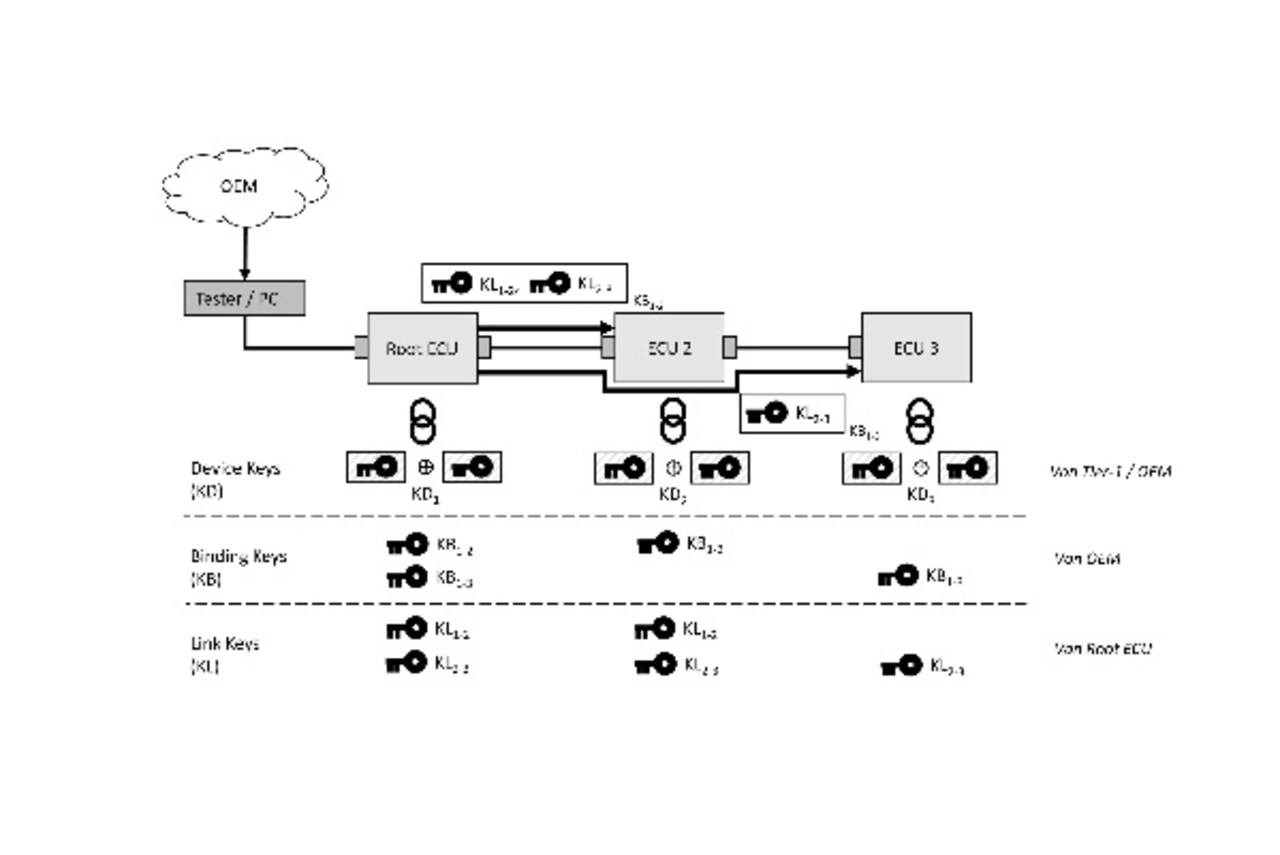 The top level of the key hierarchy uses so-called device keys, which in turn are formed from two keys of equal length per ECU: The "Tier-1 Device Key" and the "OEM Device Key". The Tier-1 Device Key is persistently burned in by the Tier-1 during the production of the ECU, thus giving the ECU a unique, secure identity in combination with a unique semiconductor identification number. This can be made known to the OEM for further processes. The second key component is written by the respective OEM during the production of the vehicle in the factory or in service, whereby the component is now bound to the OEM and the OEM assumes control and responsibility for the ECU.