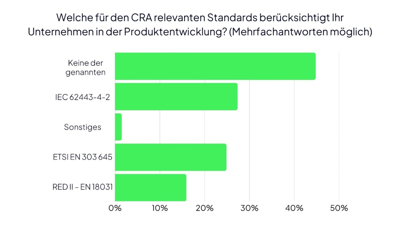 Ebenso wenig verbreitet ist die Anwendung der Norm ETSI EN 303 645, die Cybersicherheitsanforderungen für vernetzte Verbrauchergeräte beschreibt. Nur rund ein Viertel der Firmen integriert sie in Entwicklungsprozesse, obwohl sie als harmonisierte Norm des CRA gilt und Voraussetzung für die CE-Kennzeichnung ist.