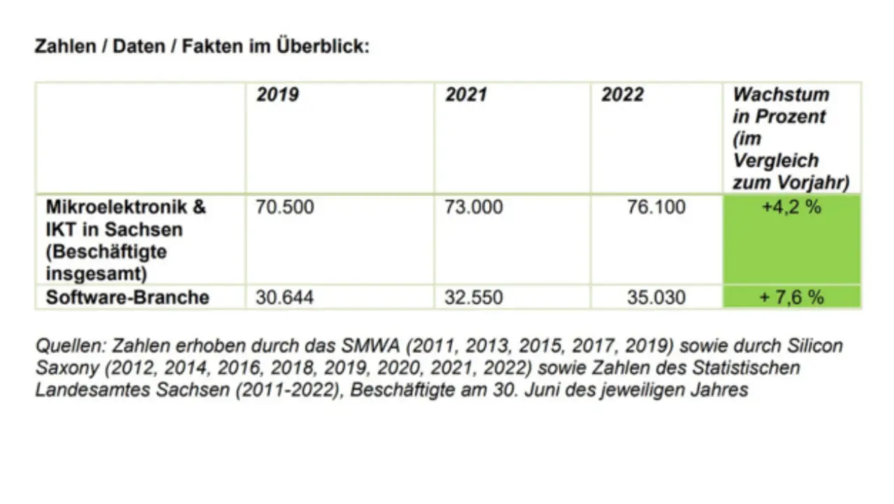 Im Vergleich zu den Zahlen des Vorjahres 2021 ist die Beschäftigung in der Branche damit um 4,2 Prozent gewachsen, etwas weniger als die sächsischen Softwareindustrie: Im Vergleich zum Vorjahr wuchs die Branche sogar um 7,6 Prozent, sie beschäftigt über 35.000 Mitarbeiter.