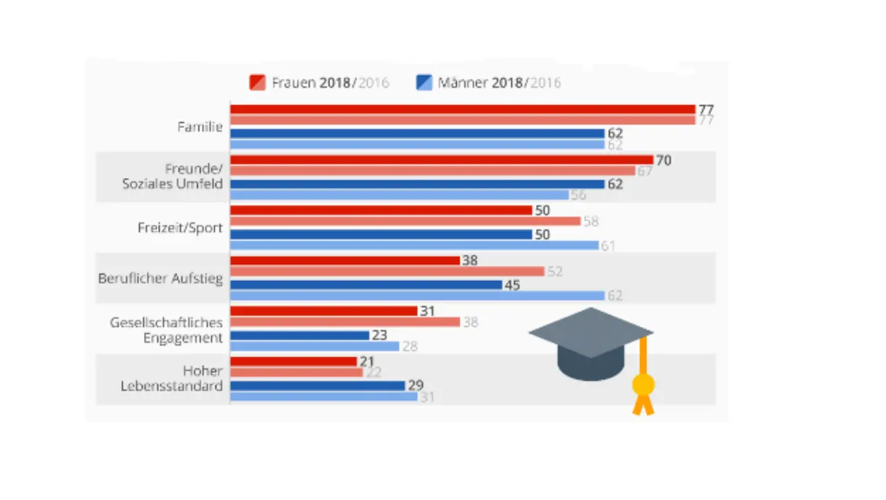 Ebenfalls gefallen sind die Werte für die Bedeutung von Freizeit und Sport, die Bedeutung von Freunden und dem sozialen Umfeld stieg hingegen, vor allem bei den männlichen Befragten. Die Wichtigkeit von Familie bleibt unverändert am höchsten.