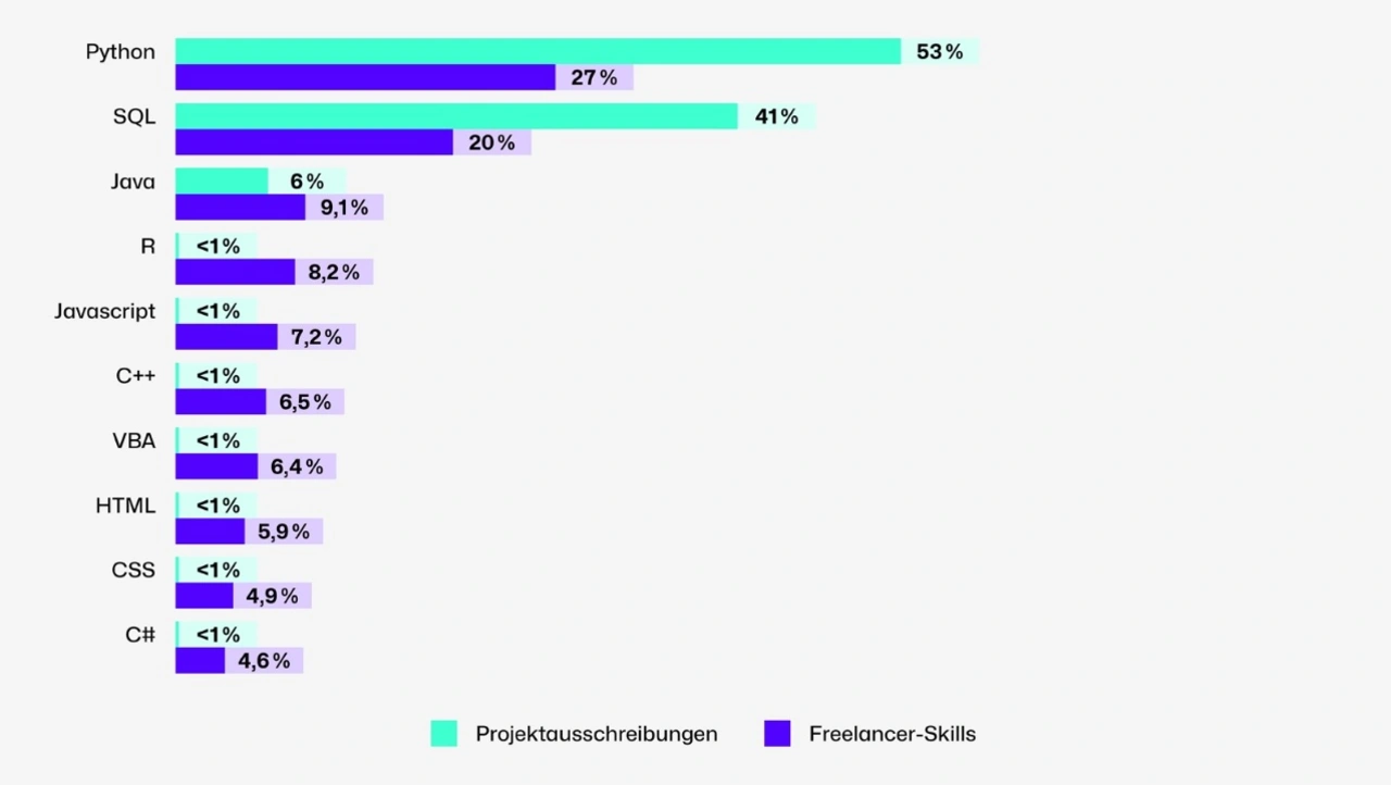 Bei den Programmiersprachen spezialisieren sich die meisten Freelancer weiterhin hauptsächlich in Python, dicht gefolgt von SQL. Doch auch Expertenkenntnisse in Java(script), R, C++, VBA und weiteren Programmiersprachen bleiben relevant. Gesucht sind vor allem Spezialisten für Python und SQL, weniger nachgefragt ist Java. Weitere Programmiersprachen spielen nur eine geringe Rolle. »Expertenkenntnisse in Python und SQL waren bereits in der ersten Auflage unseres Top-Skill-Radars am meisten gefragt«, sagt Thomas Maas, CEO von freelancermap. »Zusätzlich hat die Nachfrage nach SQL-Programmierfertigkeiten noch einmal zugenommen«.