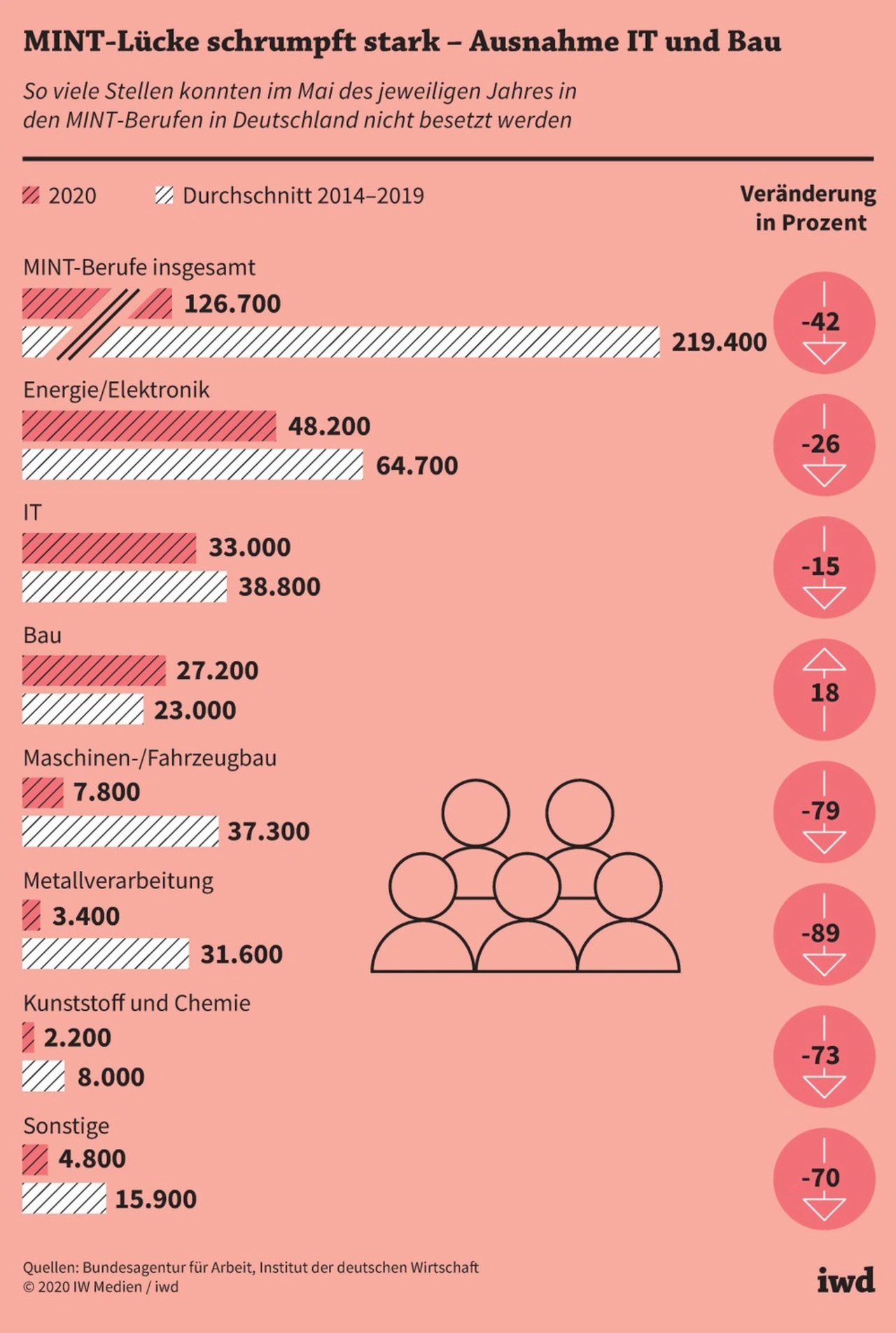 Nun aber macht die Corona-Krise einen Cut: Die Zahl der offenen MINT-Stellen ist teils drastisch zurückgegangen, die Engpässe deutlich weniger geworden, meldet das Institut der Deutschen Wirtschaft. Gegenüber Mai 2019 ein Rückgang von 59 Prozent auf 126.700. Besonders heftig war der Rückgang an offenen Stellen im Maschinen- und Fahrzeugbau sowie in der Metallverarbeitung.