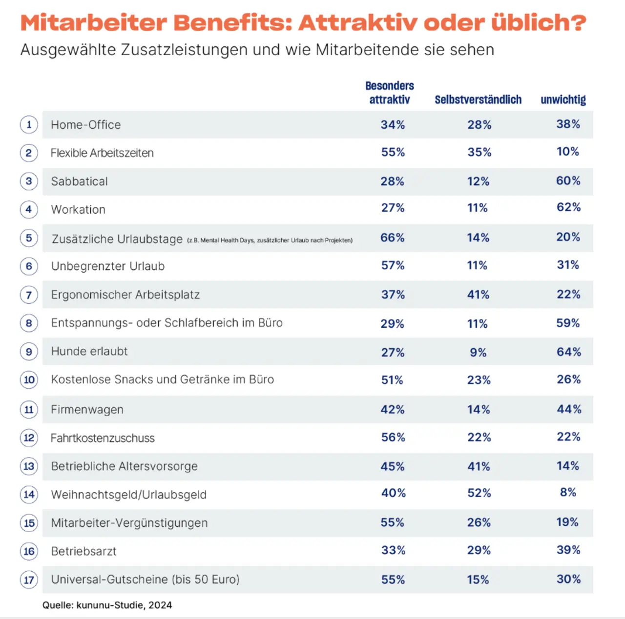 Manche Arbeitgeberleistungen halten Mitarbeitende für selbstverständlich oder gar unwichtig. Auf den Plätzen 1 bis 3: Weihnachts- oder Urlaubsgeld, das 52% der Beschäftigten erhalten, flexible Arbeitszeiten (51%) sowie Homeoffice, zu dem 45% der Mitarbeitenden freien Zugang haben. Letzteres halten mehr als ein Viertel (28%) der Beschäftigten allerdings auch für selbstverständlich und 38% für irrelevant.