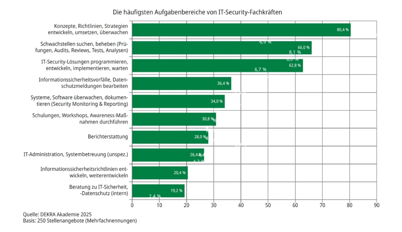 Besonders stark vertreten ist die Nachfrage in der Dienstleistungsbranche. Dort entfallen 50,8 Prozent der gesichteten Stellenanzeigen auf IT-Sicherheitspositionen. Allein 32,4 Prozent stammen von IT-Dienstleistern. Die gesuchten Fachkräfte sollen nicht nur Schwachstellen erkennen und beheben, sondern auch Sicherheitsstrategien entwickeln und umsetzen.