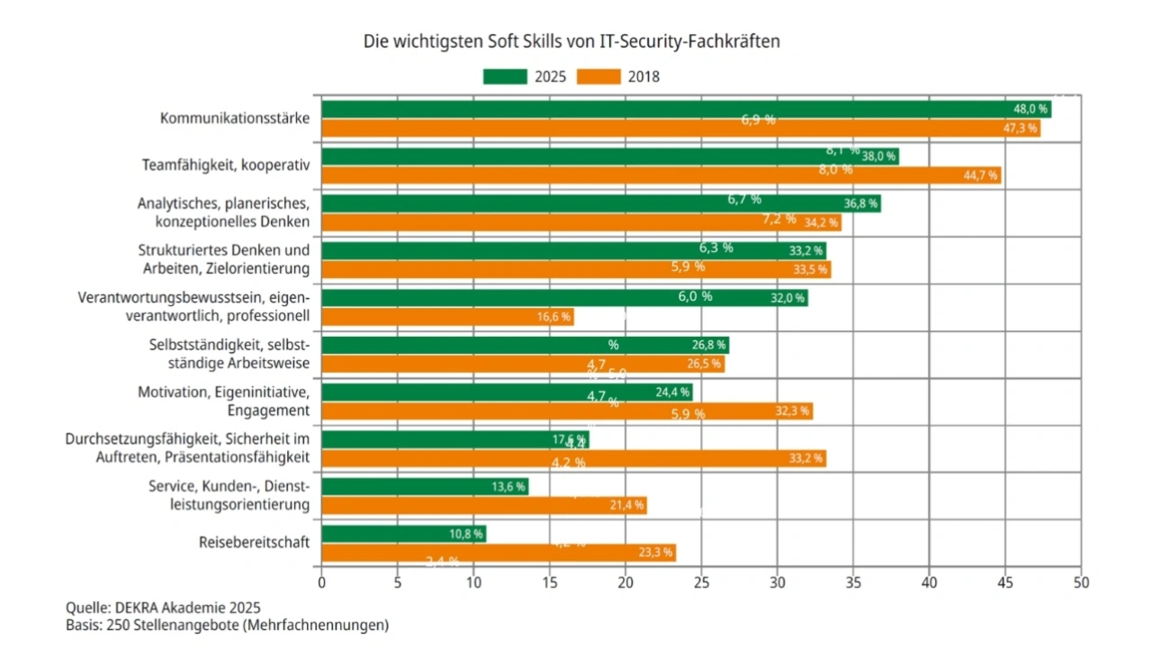 Teamfähigkeit, Kommunikationsstärke, analytisches Denken und strukturierte Arbeitsweise bleiben zentrale Anforderungen. Andere Eigenschaften wie Durchsetzungsvermögen werden seltener genannt als in früheren Jahren. Verantwortungsbewusstsein hingegen wird deutlich häufiger betont.