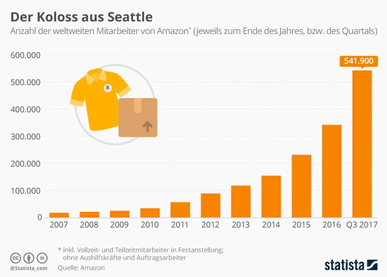 Wie die Grafik von Statista zeigt, hat Amazon weltweit mittlerweile mehr als eine halbe Million Mitarbeiter – und ein Ende des Wachstums ist nicht in Sicht.