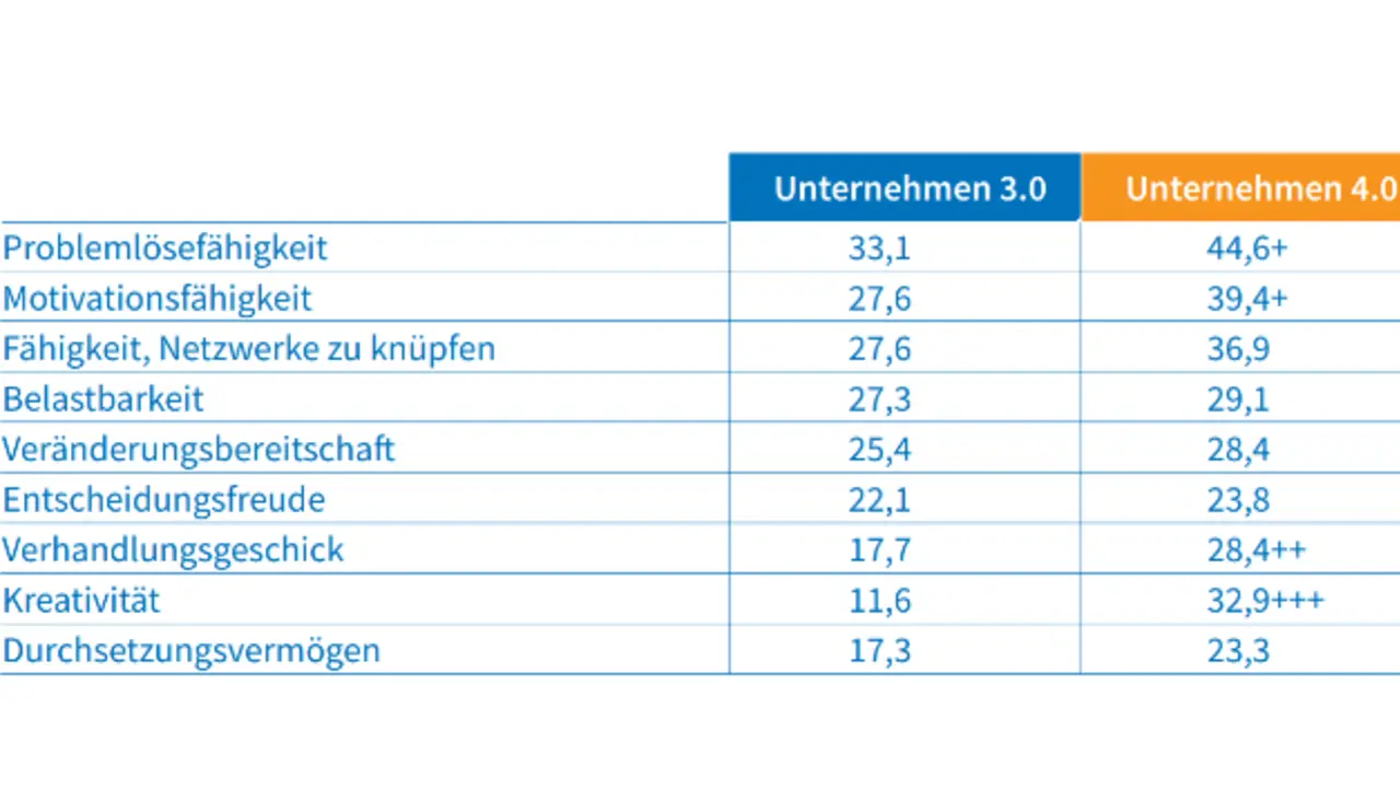 Ergebnis: Die relativ stark digitalisierten Unternehmen 4.0 erwarten im Vergleich zu den relativ wenig digitalisierten Unternehmen 3.0 in vier der neun Kompetenzbereiche signifikant häufiger einen Bedeutungszuwachs. Dies sind zum einen die Kreativität und die Problemlösefähigkeit, zum anderen aber auch das Verhandlungsgeschick und die Motivationsfähigkeit – Kompetenzen, die eng mit der Rolle der Führungskraft als Befähiger und Katalysator in Transformationsprozessen verbunden sind.
