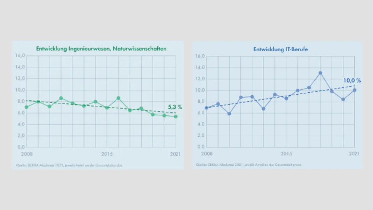 »Am Arbeitsmarkt treffen momentan unterschiedliche Entwicklungen aufeinander. Deutschland befand sich vor der Pandemie in einer konjunkturellen Abkühlung, dann kam die Covid-19-Krise und gleichzeitig vollzieht sich in manchen Branchen ein Strukturwandel. All das wirkt sich auf die Fachkräftenachfrage aus, wie wir es beispielsweise bei Ingenieurinnen und Ingenieuren beobachten«, so Katrin Haupt, Geschäftsführerin der Dekra-Akademie.