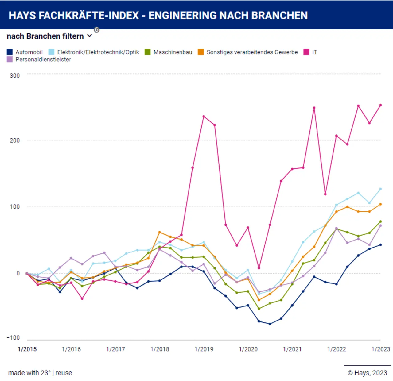 Hays veröffentlicht quartalsweise einen Fachkräfte-Index mit Fokus auf Engineering. Im 1. Quartal 2023 stieg dieser gegenüber dem Vorquartal um 19 Prozentpunkte auf 116 Prozent. Laut Hays sei das seit Beginn des Ukrainekriegs der erste Anstieg in der Nachfrage nach Ingenieuren und gleichzeitig der höchste Wert im Bezugszeitraum seit 2015.