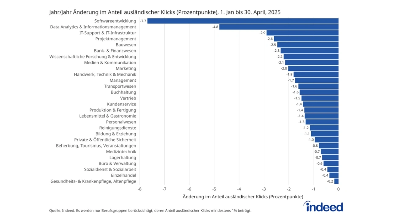 In allen Berufsgruppen sank der Anteil ausländischer Klicks auf Stellenanzeigen. Am stärksten war der Rückgang bei Tech-Jobs: In der Softwareentwicklung etwa fiel der Anteil um 7,7 Prozentpunkte, in den Bereichen Data Analytics & Informationsmanagement um 4,8 Punkte. IT-Support & Infrastruktur verzeichnete ein Minus von 2,9 Punkten.