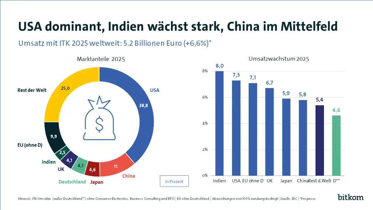 International halten die USA ihre Vormachtstellung und kommen 2025 auf einen Weltmarktanteil von 38,8 Prozent. Dahinter folgen mit deutlichem Abstand China (11,0 Prozent), Japan (4,6 Prozent) und – gemeinsam mit Großbritannien – auf Rang 4 Deutschland (je 4,1 Prozent). Indien kommt auf 2,5 Prozent Weltmarktanteil. Auf die EU ohne Deutschland entfallen 9,9 Prozent des globalen ITK-Markts.