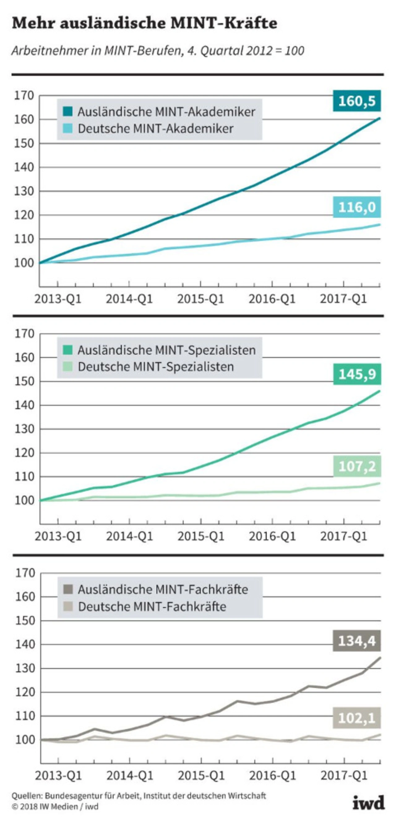 Erste Impulse für die MINT-Berufe seien auch aus der Flüchtlingsmigration zu verzeichnen. Die sozialversicherungspflichtige Beschäftigung von Menschen aus Eritrea, Irak, Afghanistan und Syrien – den Hauptherkunftsländern der Flüchtlinge – sei deutlich gestiegen: Im Jahr 2012 kamen aus diesen vier Ländern rund 2.700 MINT-Beschäftigte, im Herbst 2016 waren es bereits gut 8.000. Ein Jahr später zählten die Statistiker 16.400 Beschäftigte. Eine genaue Prognose, wie viele Flüchtlinge in den kommenden Jahren den MINT-Sektor verstärken werden, sei schwierig. Laut IW gehen Forscher anhand verschiedener Szenarien von 30.000 bis 50.000 MINT-Beschäftigten gegen Ende des Jahres 2020 aus.