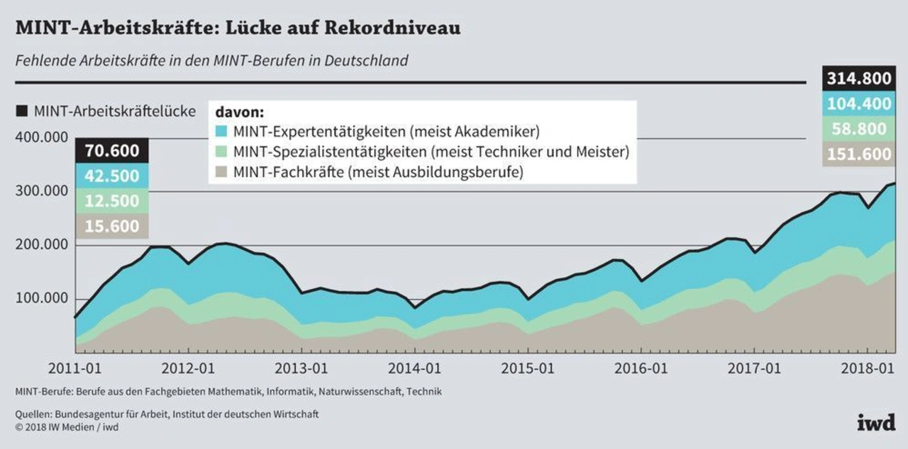 In Deutschland fehlen in den Bereichen Mathematik, Informatik, Naturwissenschaft und Technik so viele Arbeitskräfte wie noch nie, wie aus dem MINT-Frühjahrsreport 2018 des Instituts der deutschen Wirtschaft hervorgeht.