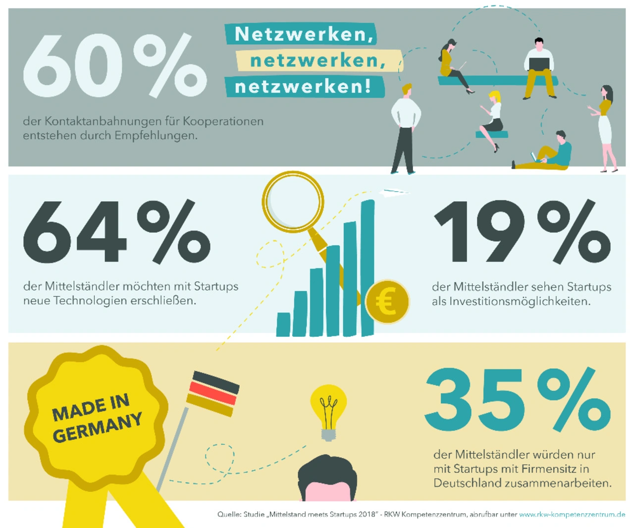 ‘Hier besteht definitiv noch Luft nach oben: In der gemeinsamen Arbeit mit Startups erschließen sich vielen etablierten Mittelständlern nicht nur neue Märkte und Zielgruppen, sondern auch Einblicke in andere Unternehmenskulturen. Deshalb sollten KMU diese Chancen unbedingt strategisch prüfen und gezielt nach passenden Gründern suchen!’, unterstreicht der Vorstandsvorsitzende des RKW Kompetenzzentrums.