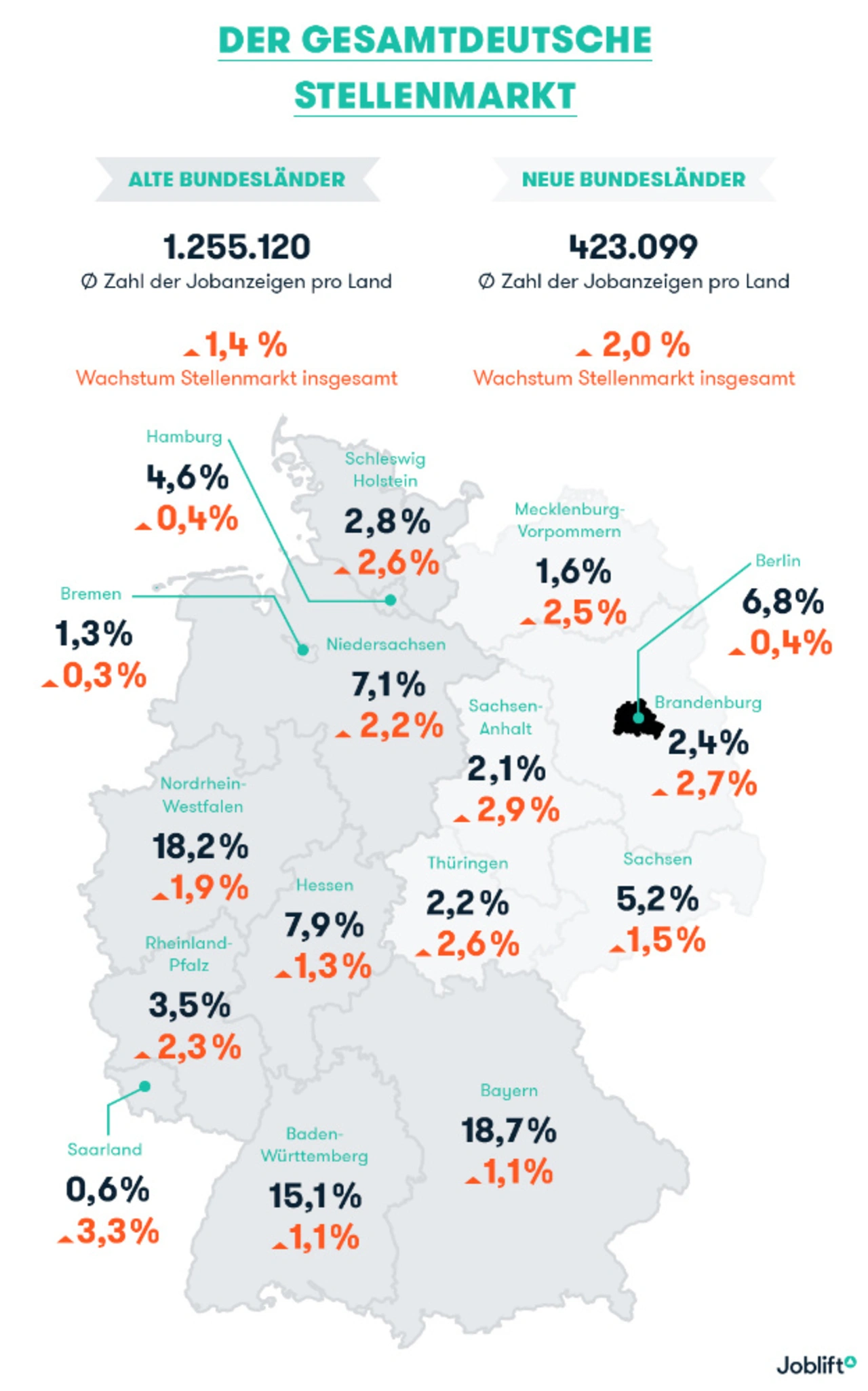 Pro Bundesland wurden in Ostdeutschland im beobachteten Zeitraum durchschnittlich 423.099 Jobanzeigen veröffentlicht, in Westdeutschland waren es 1.255.120, also dreimal so viele Ausschreibungen.