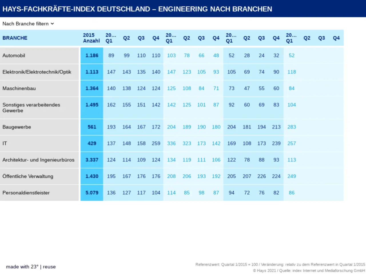 Der Hays-Fachkräfte-Index basiert auf einer quartalsweisen Auswertung der index Internet und Mediaforschung GmbH für Hays. Einbezogen werden Stellenanzeigen der meistfrequentierten Online-Jobbörsen, der Tageszeitungen und des Business-Netzwerks XING. Den Referenzwert von 100 bildet das 1. Quartal 2015.