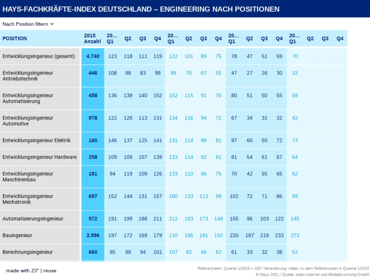 Die größten Zuwächse gab es bei Betriebsingenieuren (+43 Punkte auf 152), Bauingenieuren (+40 Punkte auf 273), Qualitätsingenieuren (+28 Punkte auf 101) und Fertigungsingenieuren (+27 Punkte auf 68).