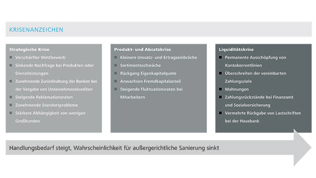 Dann kann von einer drohenden bis vollständigen Zahlungsunfähigkeit oder Überschuldung ausgegangen werden. Um dies zu vermeiden, ist der Unternehmer verpflichtet, ein waches Auge auf die Frühwarnsignale zu haben und sich jederzeit einen Überblick über die wirtschaftliche Lage des Unternehmens zu verschaffen. Im schlimmsten Fall droht ein Verfahren wegen Insolvenzverschleppung. Grundsätzlich gilt: Je weiter diese Krisenphasen fortschreiten, umso mehr kommt man von der Risikofrüherkennung zum handfesten Krisenmanagement.