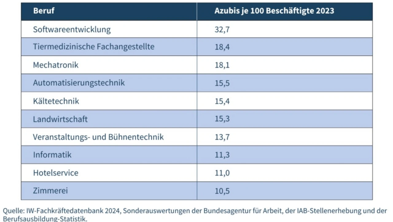 An der Spitze steht die Softwareentwicklung: Hier werden – gemessen an der Gesamtzahl der Beschäftigten – die meisten Azubis in den Berufen Fachinformatiker und mathematisch-technischer Softwareentwickler ausgebildet.