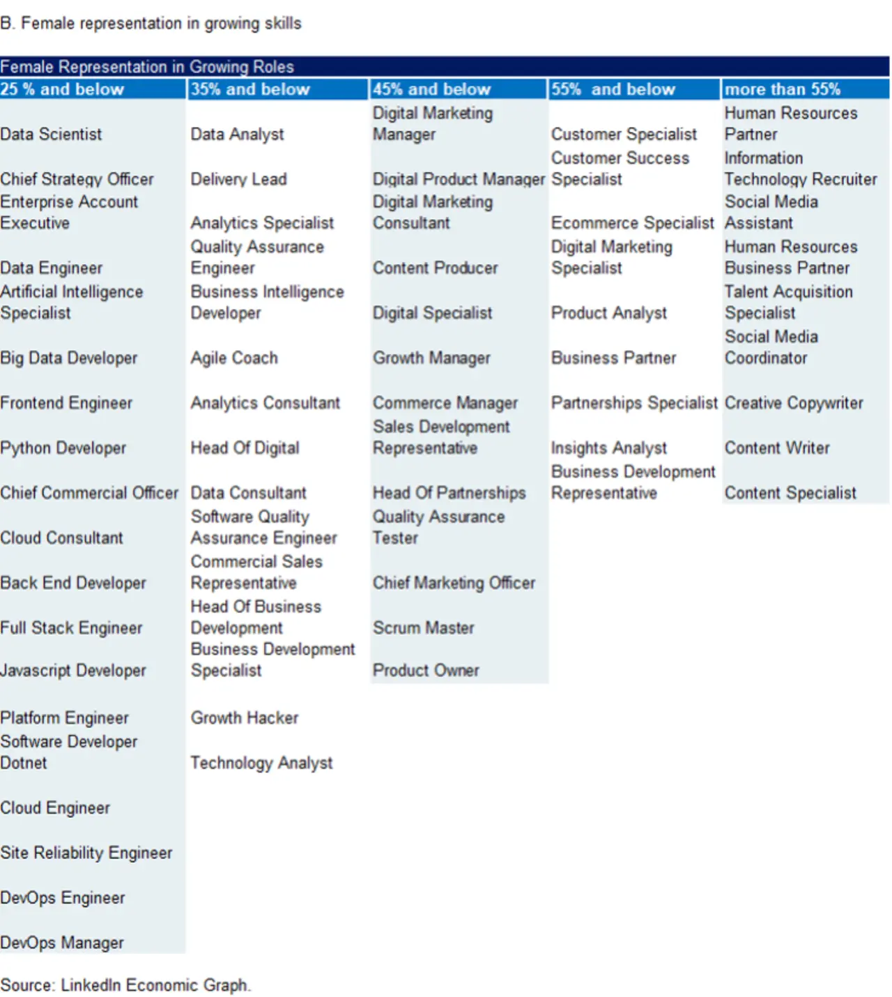 LinkedIn hat für die neueste Ausgabe des Global Gender Gap Reports des World Economic Forum 99 Jobs aus 20 Arbeitsmärkten identifiziert, die in den letzten Jahren besonders stark gewachsen sind, darunter Produktentwicklung, Cloud Computing, Software Engineering sowie Daten und Künstliche Intelligenz. Obwohl diese Felder einen hohen Zustrom an neuen Arbeitskräften verzeichnen, herrscht aber aktuell nur in zwei von ihnen Geschlechter-Parität, nämlich im Personalwesen und der Content Produktion.