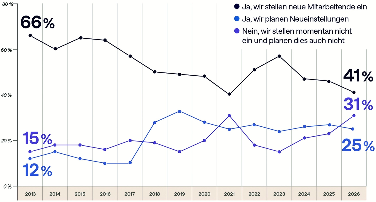 Die Zahlen zeigen eine klare Entwicklung: Während 2012/2013 noch 66 Prozent der Unternehmen aktiv rekrutierten, sind es 2026 nur noch 41 Prozent. Gleichzeitig hat sich der Anteil der Unternehmen, die keine Neueinstellungen planen, von 15 auf 31 Prozent mehr als verdoppelt.