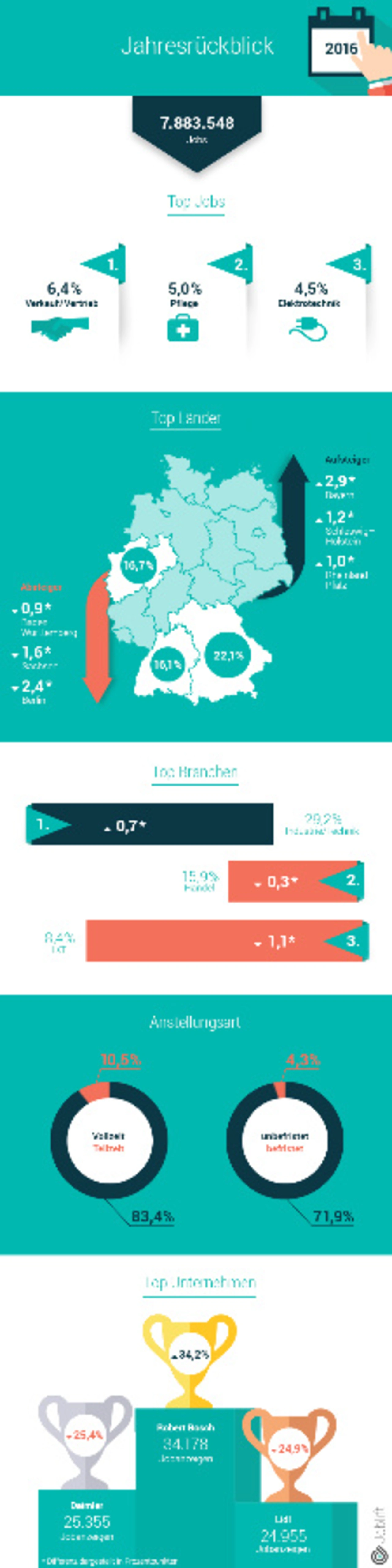 Den größten Zuwachs aller Branchen konnte das Gesundheits- und Sozialwesen mit einem Anstieg von 1,7 Prozentpunkten verzeichnen, die IKT-Branche büßte hingegen die meisten Stellenanzeigen (- 1,1 Prozentpunkte) ein. Unter den Unternehmen, die die meisten Stellenanzeigen ohne Zwischenschaltung von Personalvermittlungen ausschrieben, befanden sich Robert Bosch mit 34.178 veröffentlichten Stellen, Daimler mit 25.355 Jobanzeigen, Lidl mit 24.955 und die Deutsche Bahn mit 15.493 geschalteten Jobs.