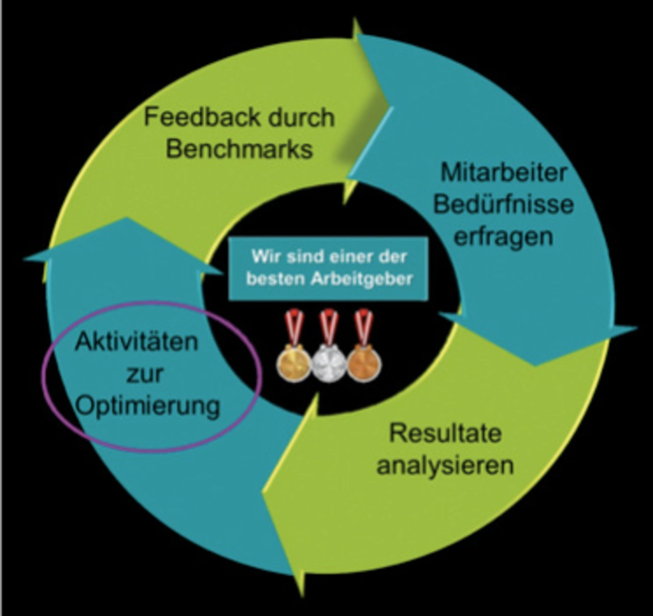 Aus jeder Befragung resultieren Analysen über alle Bereiche, die an die Unternehmensleitung berichten. Der Bereichsleiter kennt dabei nicht die konkreten Ergebnisse anderer Bereiche – denn es soll kein Schaulaufen erzeugt werden –, wohl aber den Durchschnittswert des gesamten Unternehmens. So kann er erkennen, ob er über- oder unterdurchschnittlich ist. Liegt er weit unter dem Durchschnitt, hat er größeren Handlungsbedarf, als wenn er nur knapp darunter liegt. Der Status der HR-Maßnahmen in ihren Bereichen wird regelmäßig zwischen Geschäftsführung und dem oberen Management diskutiert und bewertet. Durch diese HR-Bilanz erfährt das Management, was die Mitarbeitenden als besonderen Vorteil ihres Arbeitgebers bewerten.