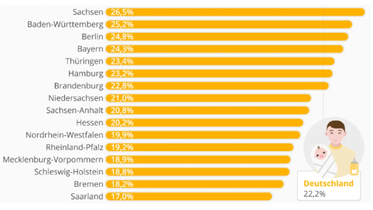 Rund 22 Prozent der Väter in Deutschland haben im Jahr 2016 Elterngeld bezogen. Das geht aus einem aktuellen Bericht des Statistischen Bundesamts hervor. Welches Bundesland ist Vorreiter?