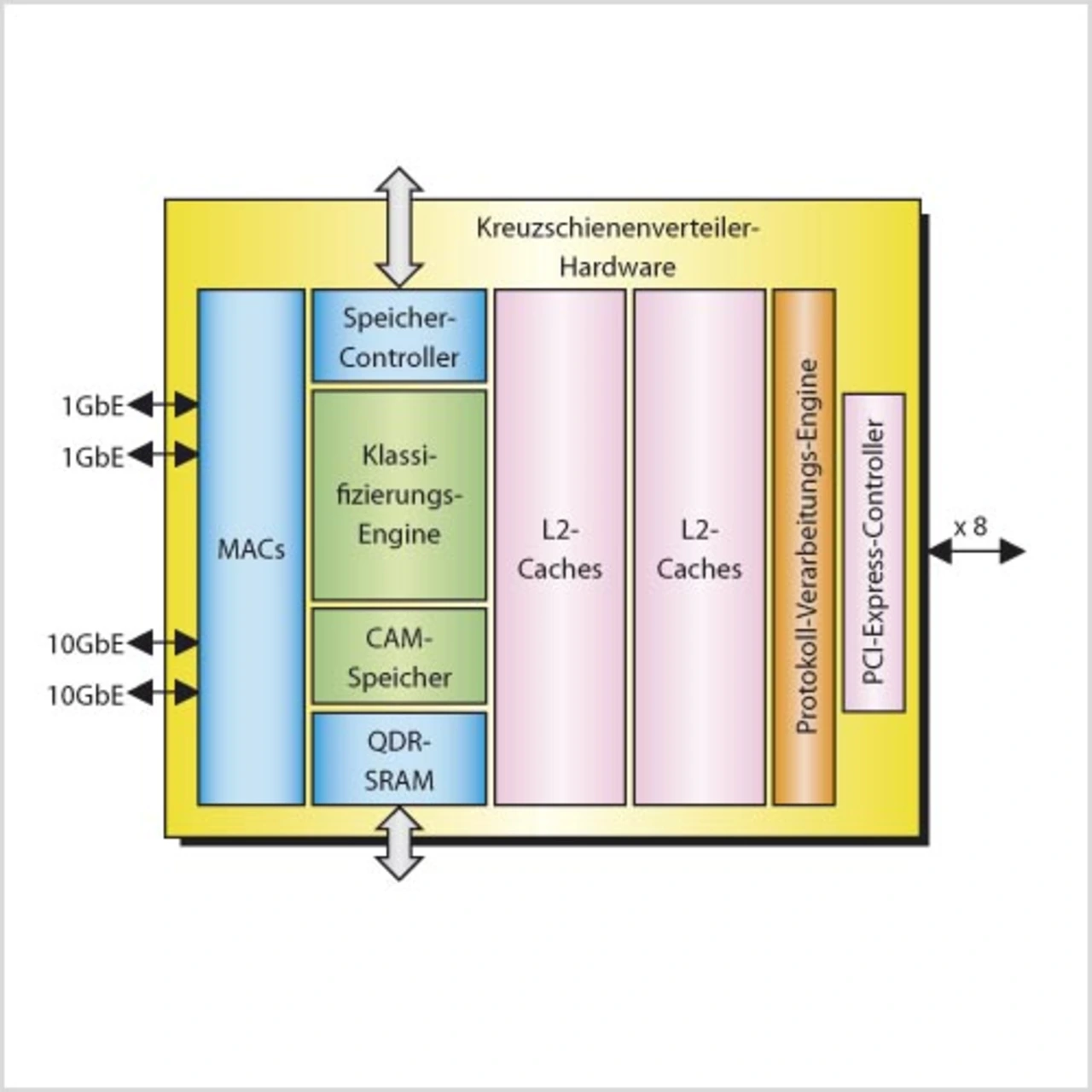 Der Chip bietet auf der Ethernet- Seite zwei 10GbE- und zwei 1GbEPorts, die Anbindung an das Host-System erfolgt per PCI-Express-Schnittstelle. Für die Kommunikation zwischen den Elementen auf dem Chip wird ein Kreuzschienen-Verteiler genutzt. Der Chip kann alle von den Ethernet-Ports kommenden Daten und Botschaften verarbeiten. Auf der Basis des Chips wurde eine 10-Gbit/s-NIC entwickelt, in die sich ein Standard- XFP-Modul (10 Gigabit Small Form Factor Pluggable) für die Übertragung über Lichtwellenleiter einsetzen lässt.
