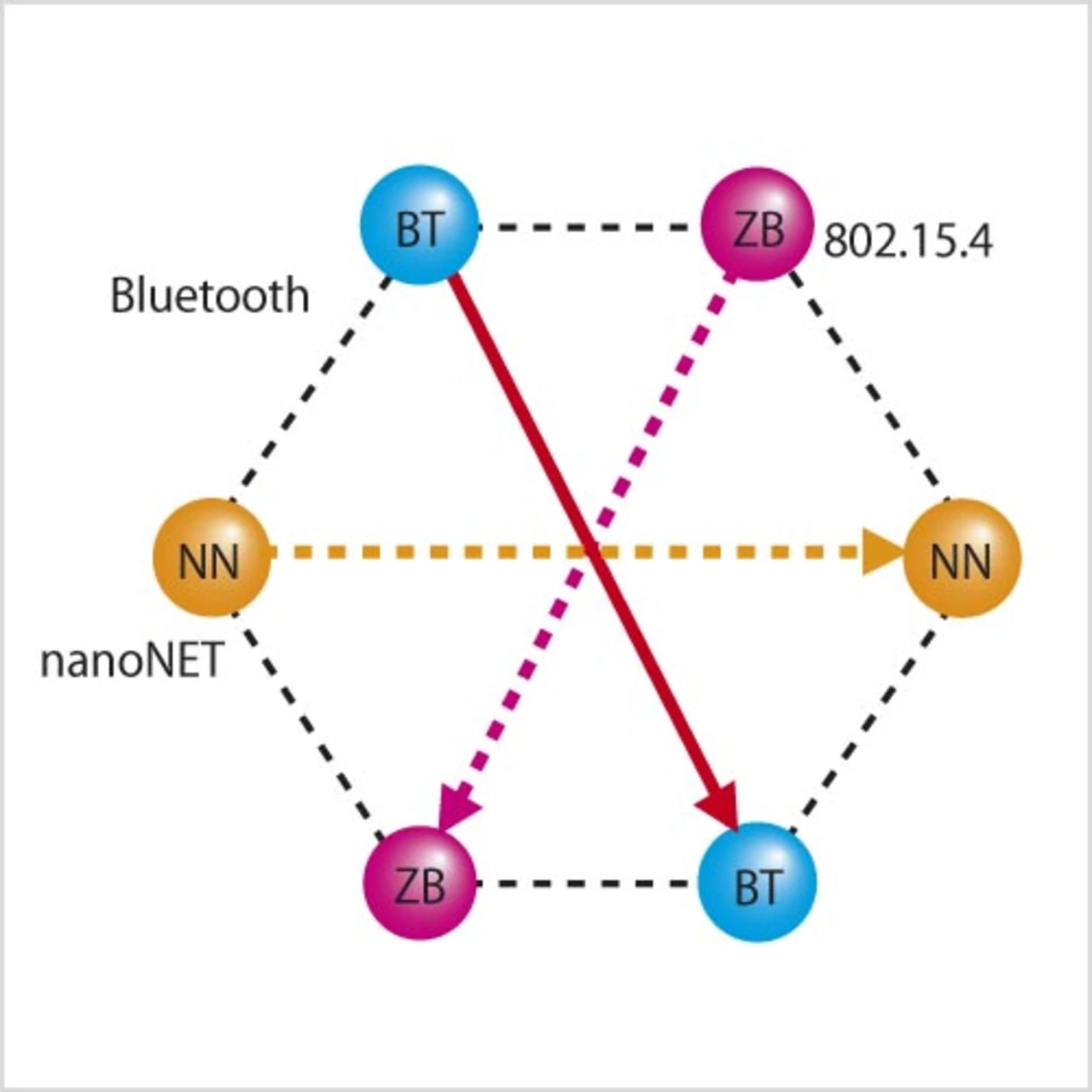 Entsprechend Bild 9 wurden die Funkmodule angeordnet. BT ist die Abkürzung für die Bluetooth-Module, ZB für die IEEE-802.15.4- Module und NN für NanoNET.