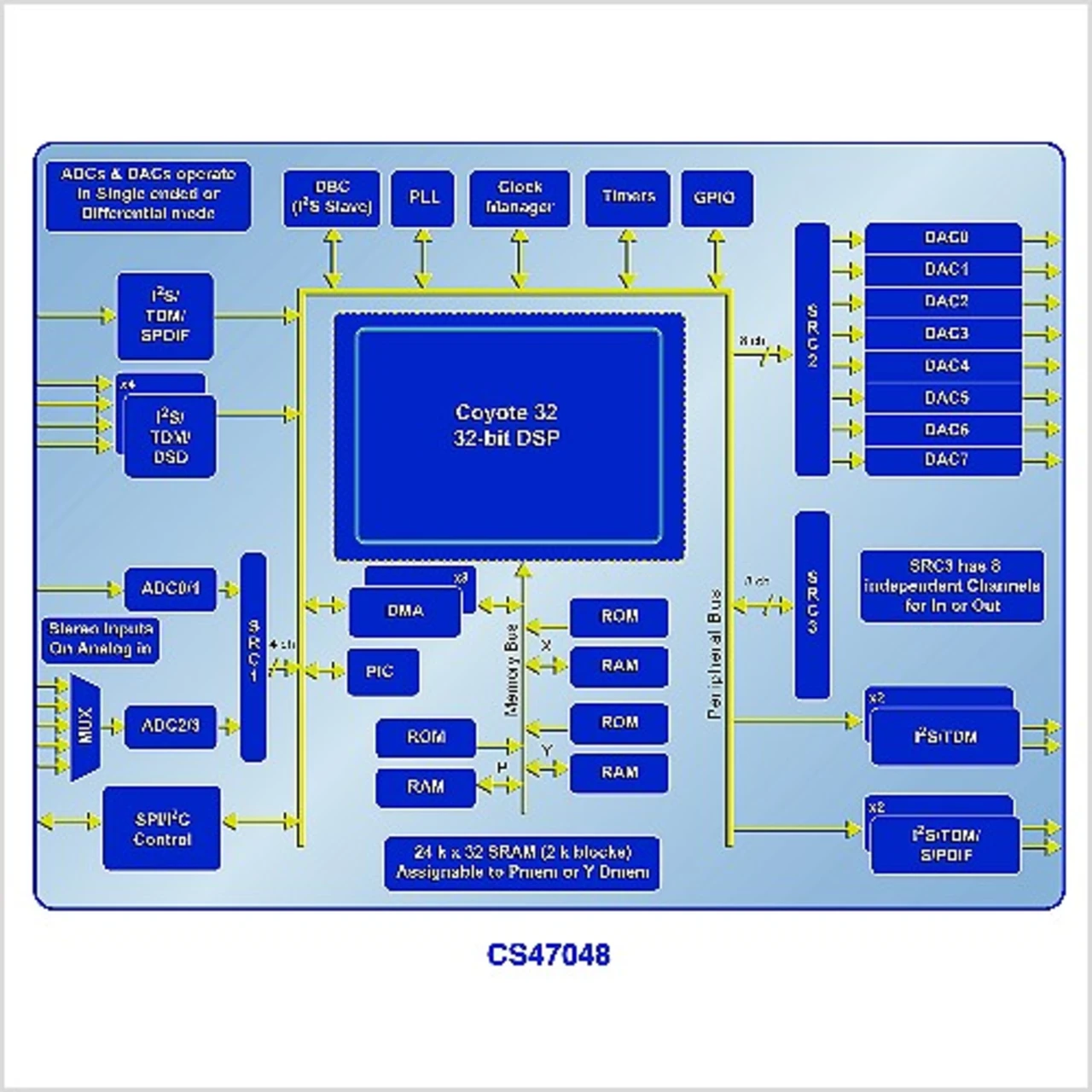 Cirrus Logics im CS47048 eingesetzte Technologien ermöglichen die gemeinsame Unterbringung der Mixed-Signal-Audioumsetzer und eines Hochleistungs-DSPs im selben Chip unter Beibehaltung einer sehr guten analogen Leistung. Die patentierte Technologie bietet neue kontinuierliche Zeitarchitekturen, wodurch sich die Trennung zwischen den Umsetzern und dem DSP verbessert und die hohe Leistung des DSP bei geringst möglichen Auswirkungen auf die Umsetzerleistung ermöglicht wird. Der 4-Kanal-A/D-Umsetzer arbeitet mit 105 dB Dynamikbereich und bietet -98 dB THD+N. Die 8-Kanal-D/A-Umsetzer ihrerseits bieten 108 dB Dynamikbereich und -98 dB THD-N. Für SoC-Produkte sind das Leistungskennzahlen, die denen der besten marktgängigen eigenständigen Multichannel-Codes in nichts nachstehen.