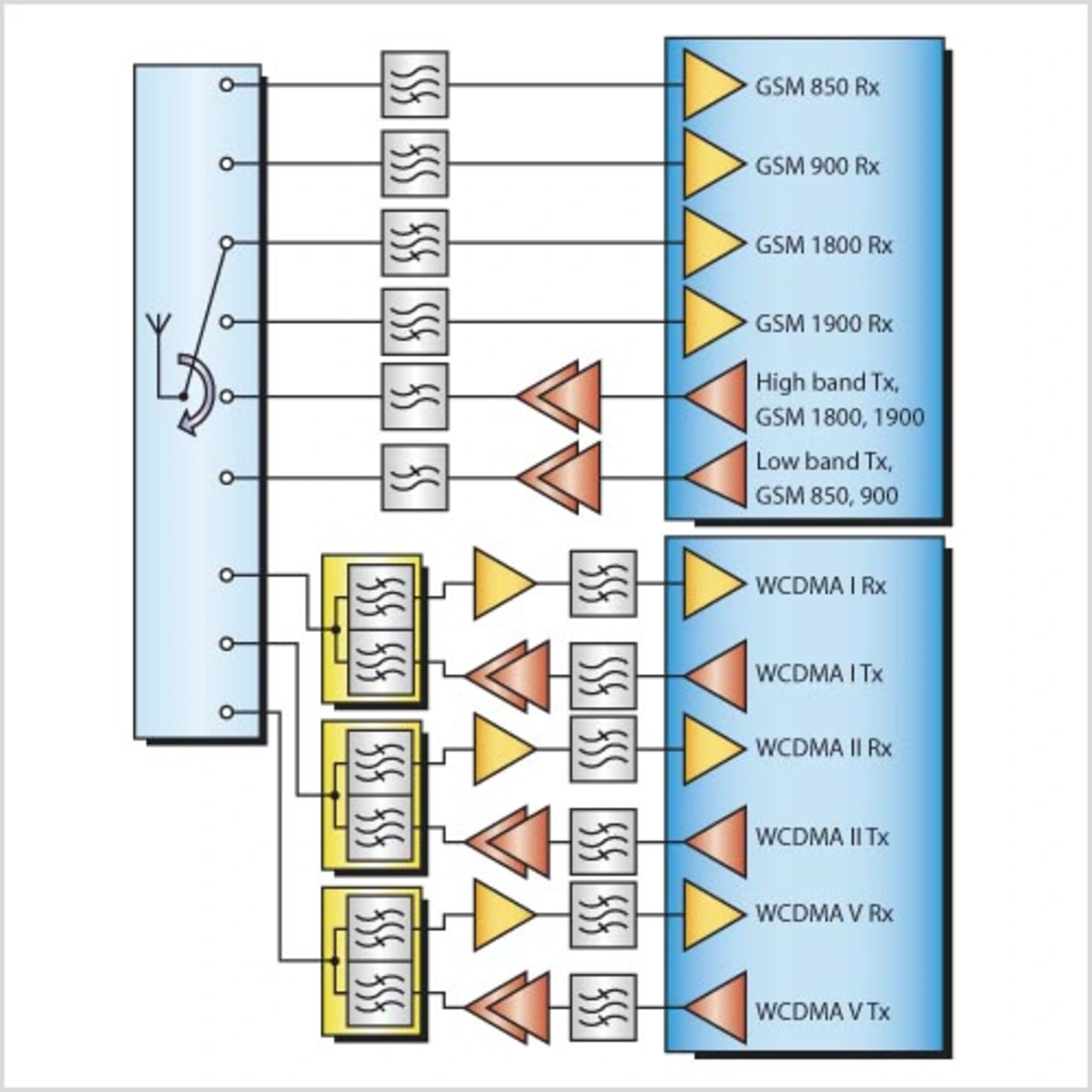 Beim Betrachten der Frequenzbänder in der Tabelle wird ersichtlich, dass GSM-850 und WCDMA Band V im gleichen Empfangsfrequenzband arbeiten. Das Gleiche gilt für GSM-1900 und WCDMA Band II. So kann das Empfangsfilter des entsprechenden WCDMA-Bands auch für GSM genutzt werden. Das gleiche Konzept kann auf GSM/WCDMA-Mobiltelefone mit den für Europa freigegebenen Bändern I, III und VIII sowie den in Japan genutzten Bändern I, III (IX) und V (VI) angewandt werden.