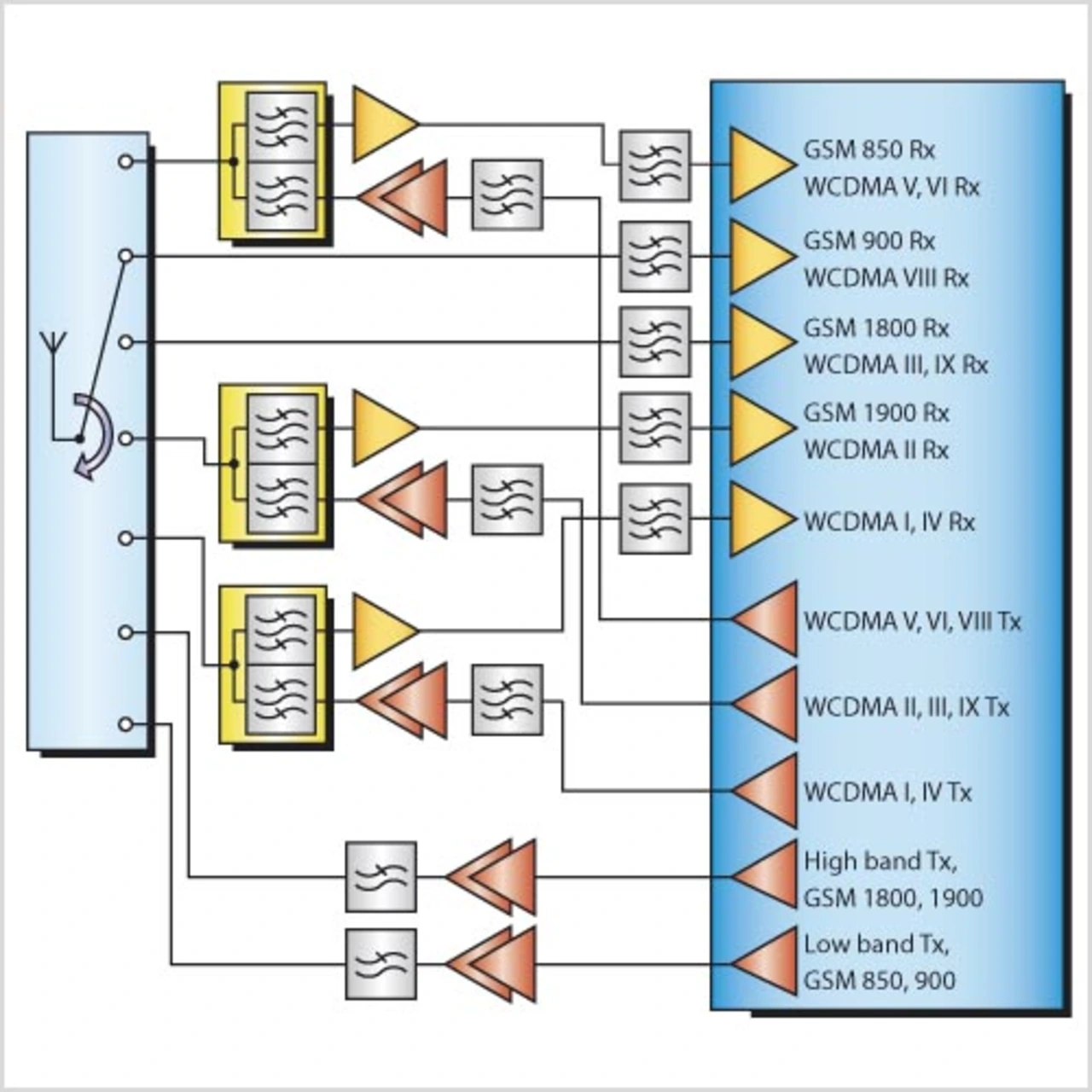Im Rahmen dieses Ansatzes kann ein herkömmliches Quadband-GSM- /Band-I-WCDMA-Frontend um zusätzliche WCDMA-Bänder erweitert werden. In Richtung Antenne wird dabei ein SP9T-Schalter (CMOS-Multiplexer mit neun Schaltstufen) verwendet (Bild 1).