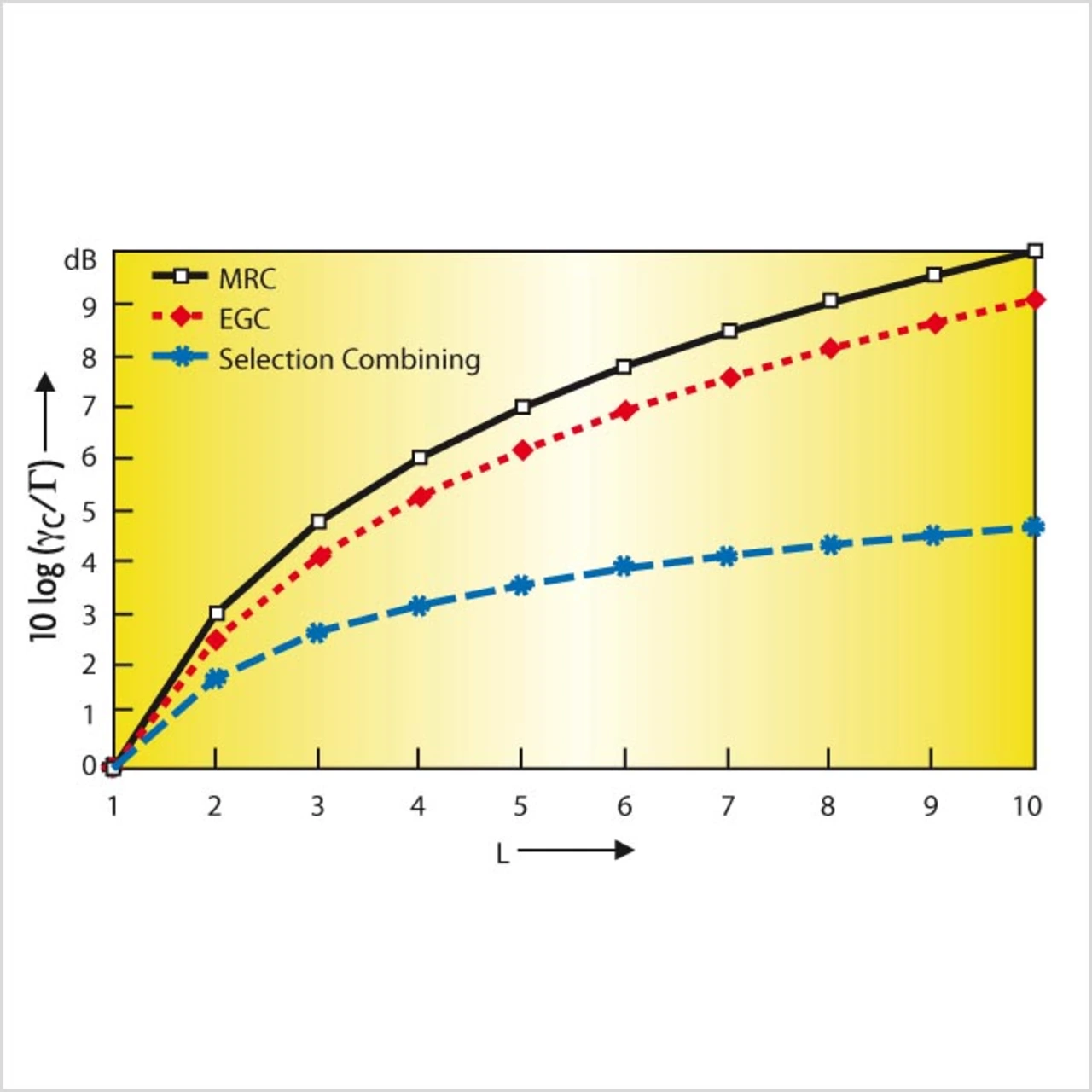 Selection Combining bewertet die jeweiligen Datenkanäle und sucht den Kanal mit dem besten Störabstand (S/N) aus. Eine geeignete Auswahllogik muss in der Lage sein, anhand der analogen oder digitalen Parameter des Kanals aktiv zu werden. Der Gewinn ist abhängig von der Anzahl der Antennen und lässt sich berechnen: