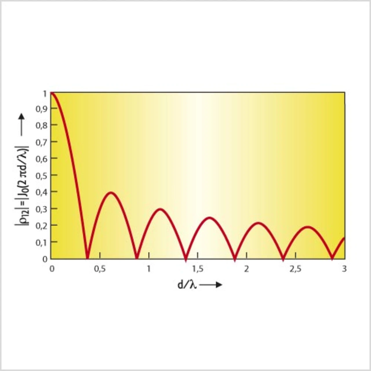 Für einen derartigen Rayleigh-Kanal, der prinzipiell industrielle Umgebungen akzeptabel beschreibt, können die optimalen Antennenabstände für unkorrelierte Kanäle durch die modifizierte Besselfunktion 0-ter Ordnung beschrieben werden (Bild 5). Die Nullstellen der modifizierten Besselfunktion 0-ter Ordnung zeigen auf Antennenabstände bei Rayleigh-Kanälen, an denen keine Korrelation zwischen den Empfangssignalen unterschiedlicher Antennen vorliegt. Um den Aufbau möglichst kompakt zu halten, ist die erste Nullstelle mit einem Verhältnis d/λ = 0,382 die erste Wahl für den Antennenabstand. Um einen richtungsselektiven Empfang auszuschließen, wurde eine symmetrische Anordnung der drei Antennen im Abstand von 4,69 cm gewählt, was einer Systemabstimmung auf die Mittenfrequenz 2,45 GHz (IEEE 802.15.4 O-QPSK, Kanal 8) gleichkommt.