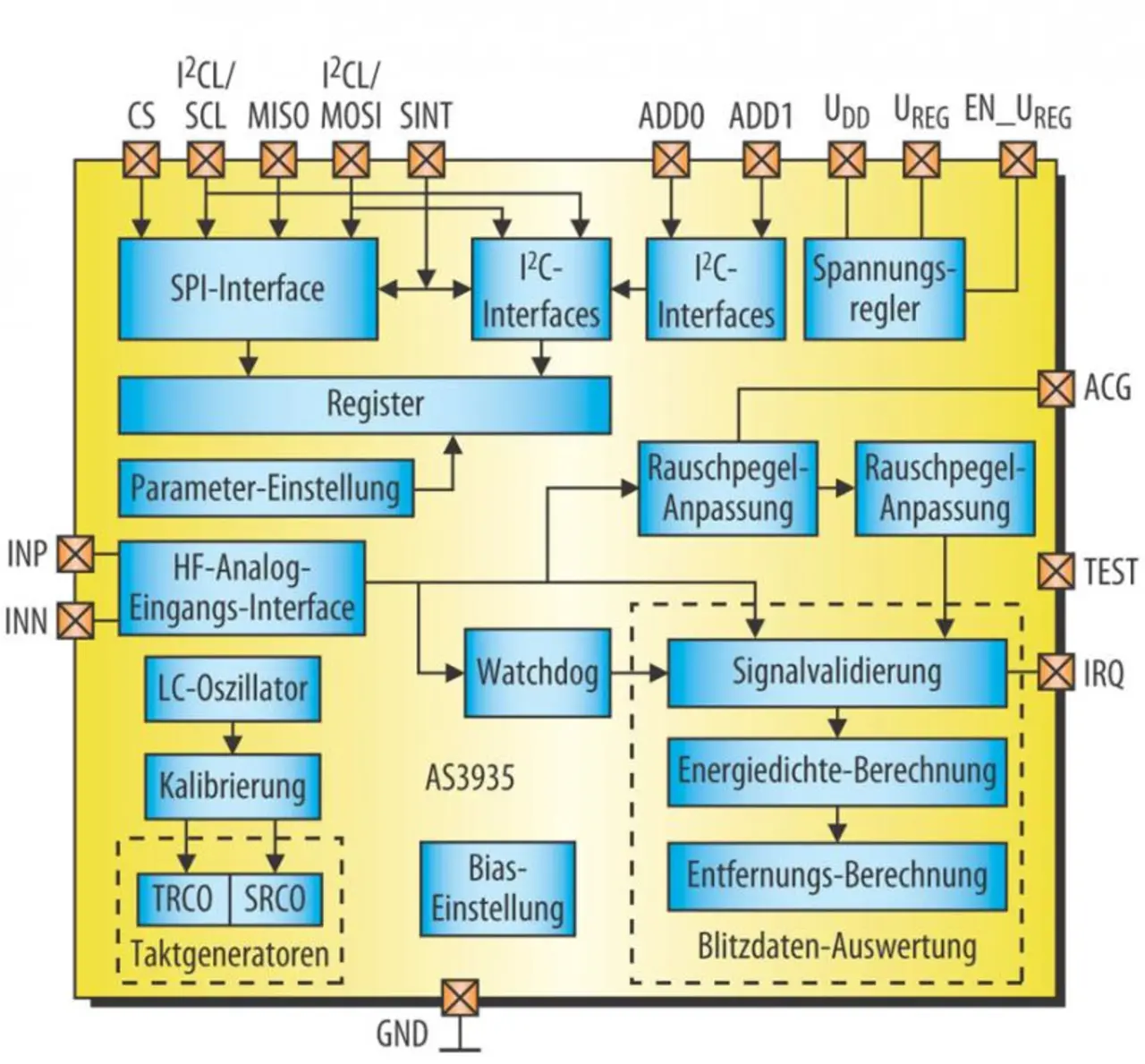 Zu den Kernelementen des Chips zählen neben einer Signalauswerteschaltung insbesondere ein sehr empfind-licher HF-Empfänger, der die elektromagnetischen Aktivitäten in der Umgebung von Gewittern aufnimmt (Bild 2). Er registriert die Annäherung eines mit Blitzen einhergehenden Gewitters bereits ab einer Entfernung von 40 km. Aus den unterschiedlichen Charakteristika der jeweils den Blitzen zugeordneten elektromagnetischen Felder errechnen die in der Auswerte-einheit implementierten Algorithmen dann sowohl die Intensität als auch die Annäherungsgeschwindigkeit.