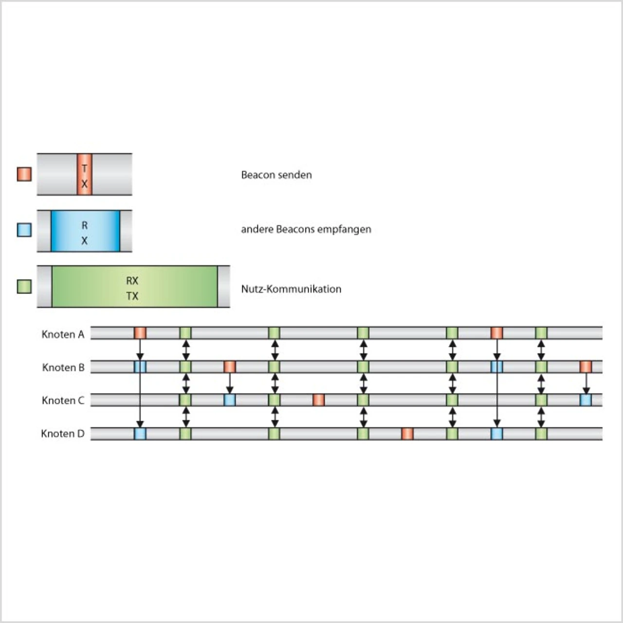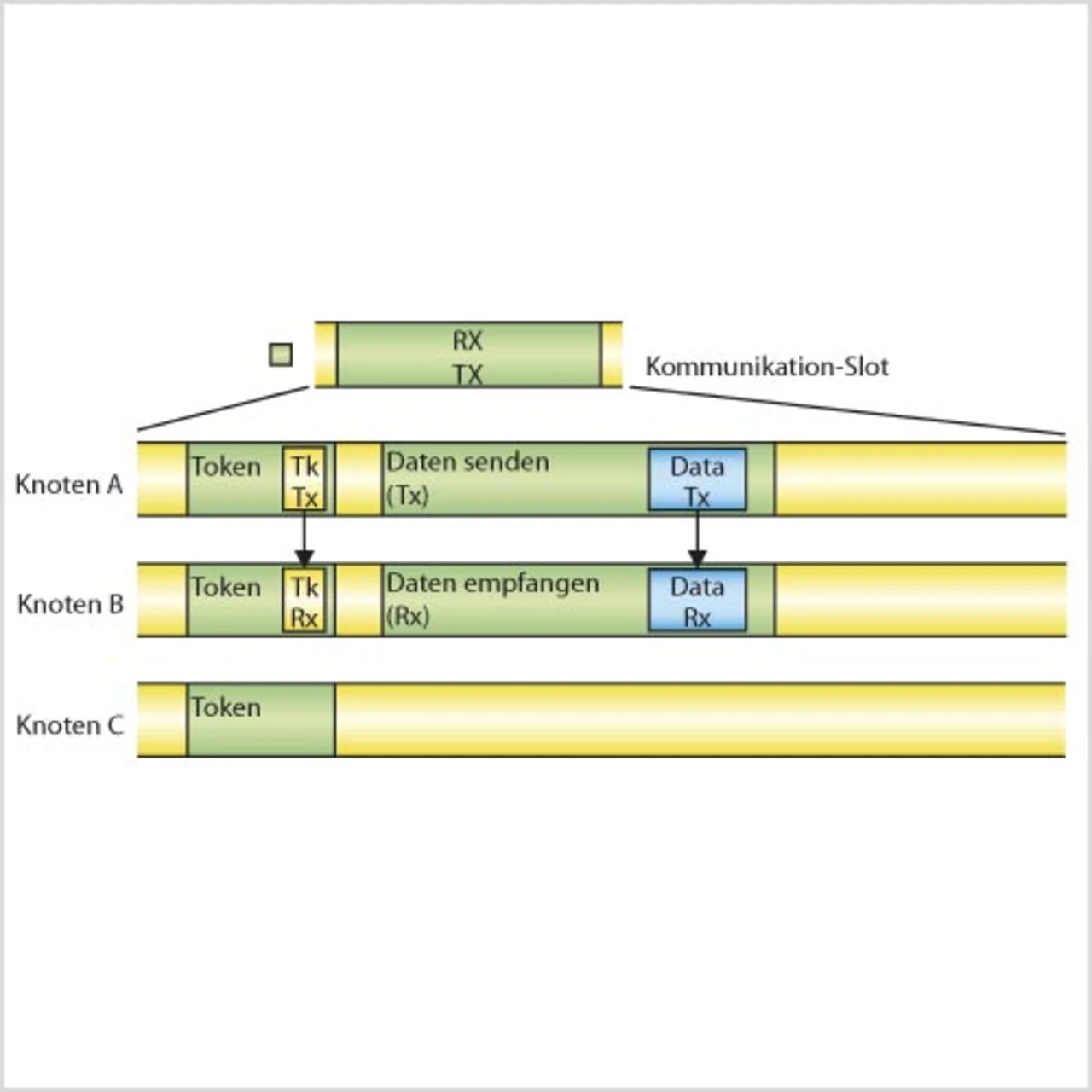 Zusätzlich werden Wakeup-Tokens eingeführt, die innerhalb eines Kommunikations-Slots Datenübertragungen zwischen dedizierten Knoten ankündigen (Bild 3). Nicht betroffene Knoten können sofort nach Erhalt und Prüfung des Tokens wieder in einen Energiesparmodus wechseln, was eine weitere Reduzierung des Energieverbrauches ermöglicht.