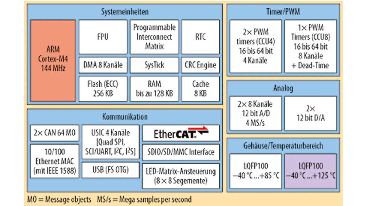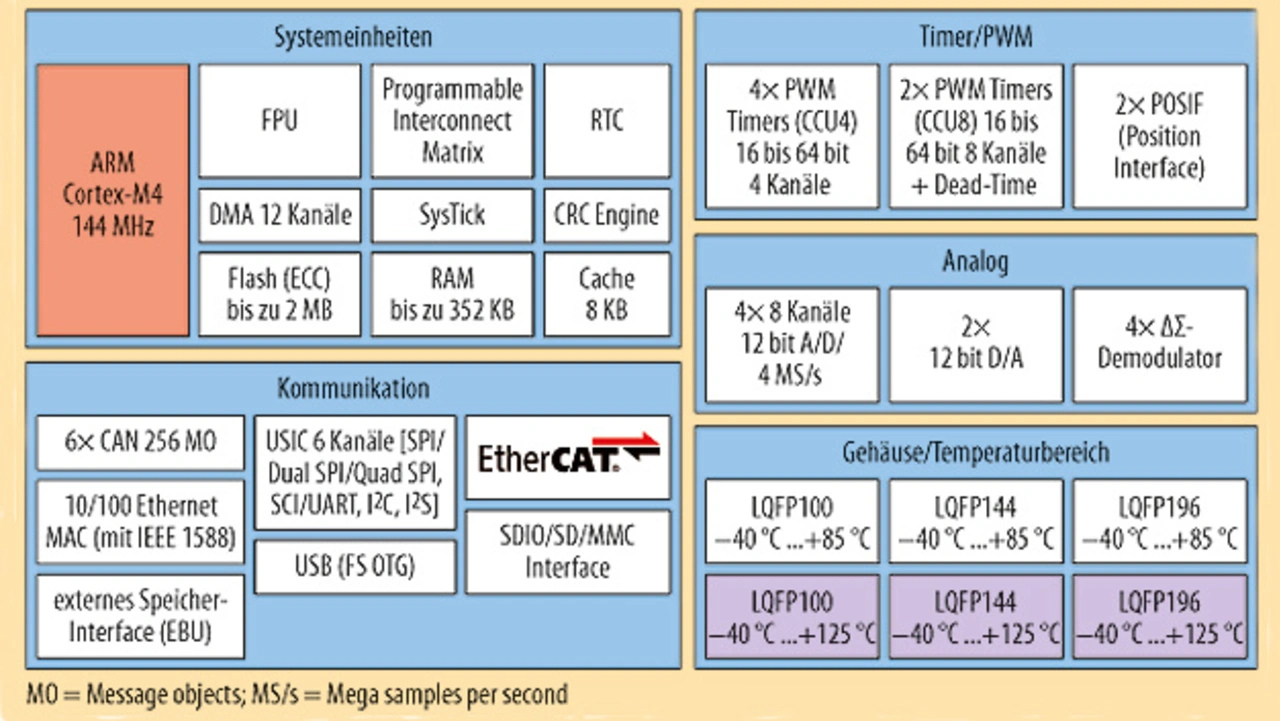 Der XMC4800 verfügt über umfangreiche Systemressourcen, die neben der EtherCAT-Kommunikation auch die Implementierung der Ansteuerung für leistungsfähige Aktorik bzw. Sensorik ermöglichen. So lässt sich neben EtherCAT auch die Ansteuerung von zwei Motoren inklusive Positionserfassung (POSIF Interface) implementieren.