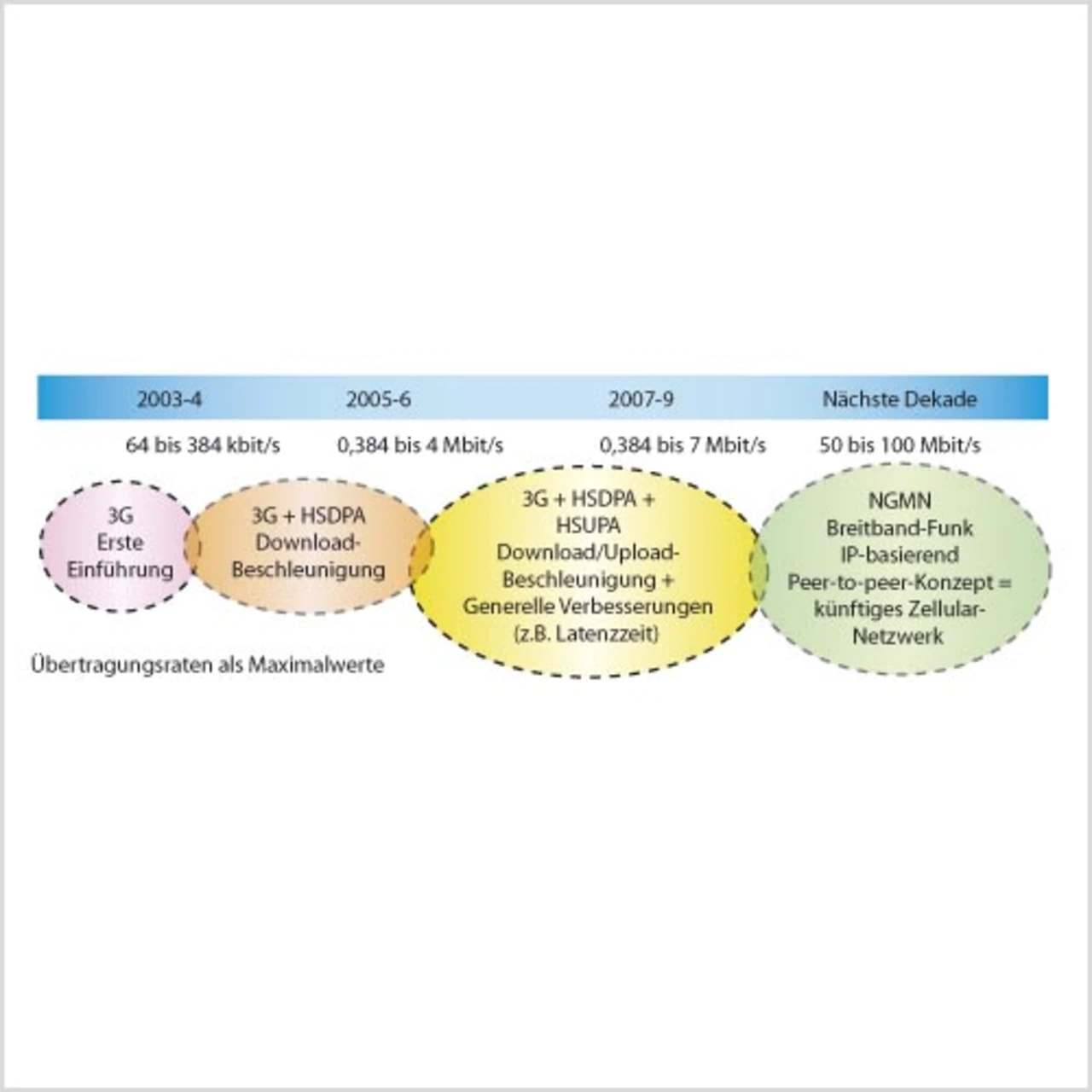 Und selbst wenn man die Übertragungsraten als Maximalwerte ansieht und in einer ausgelasteten Zelle nur ein Zehntel erwartet, dann ist das immer noch genug, um High-speed-Mobilfunk für das Internet und Multimedia zu schaffen. Aber auch die Entwicklungen rund um die UMTS-Highspeed- Nachfolge LTE sind im Geschwindigkeitsrennen mit dabei.