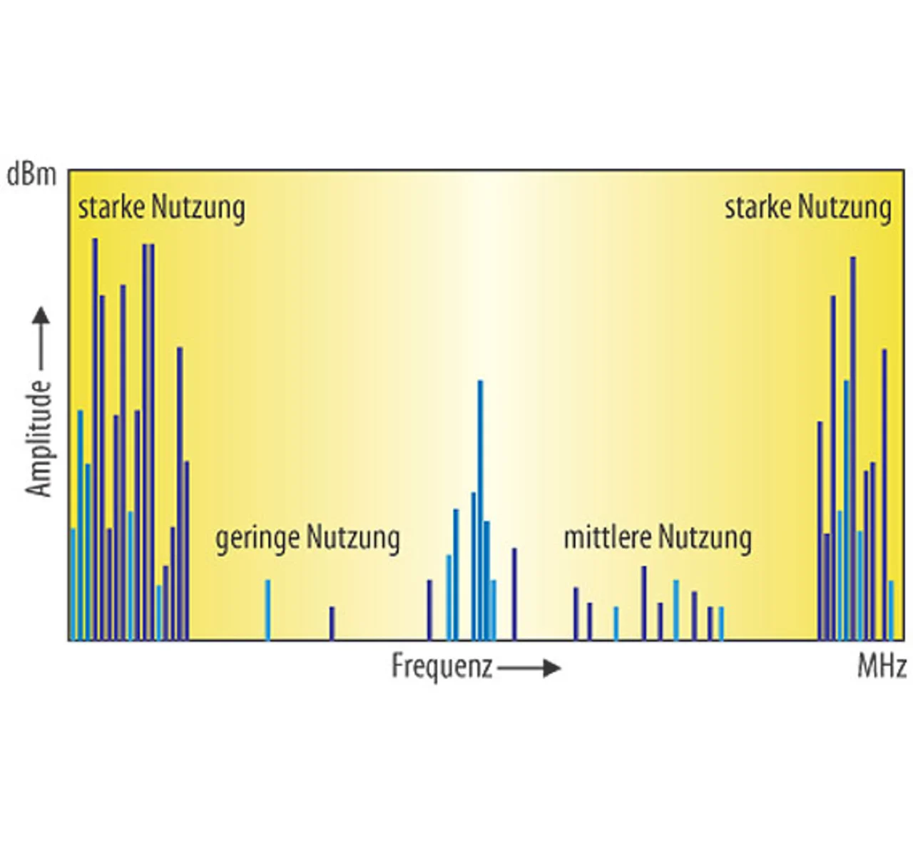 Betrachtet man die Belegung des verfügbaren Frequenzspektrums für Wireless-Anwendungen genauer, so zeigt sich, dass manche Frequenzbänder die meiste Zeit nur wenig oder gar nicht belegt sind. Andere Frequenzbereiche, wie z.B. in den ISM-Bändern, werden dagegen sehr intensiv genutzt. Ein typisches Nutzungsprofil ist in Bild 1 dargestellt [1]. Das elektromagnetische Spektrum weist also „spektrale Löcher“ hinsichtlich seiner Belegung auf [2]. Unter einem spektralen Loch versteht man ein Frequenzband, das einem primären Nutzer zugeordnet ist, das aber zu einer bestimmten Zeit und an einem spezifischen geografischen Ort von diesem nicht verwendet wird, obwohl ihm die Rechte dafür zugewiesen wurden.