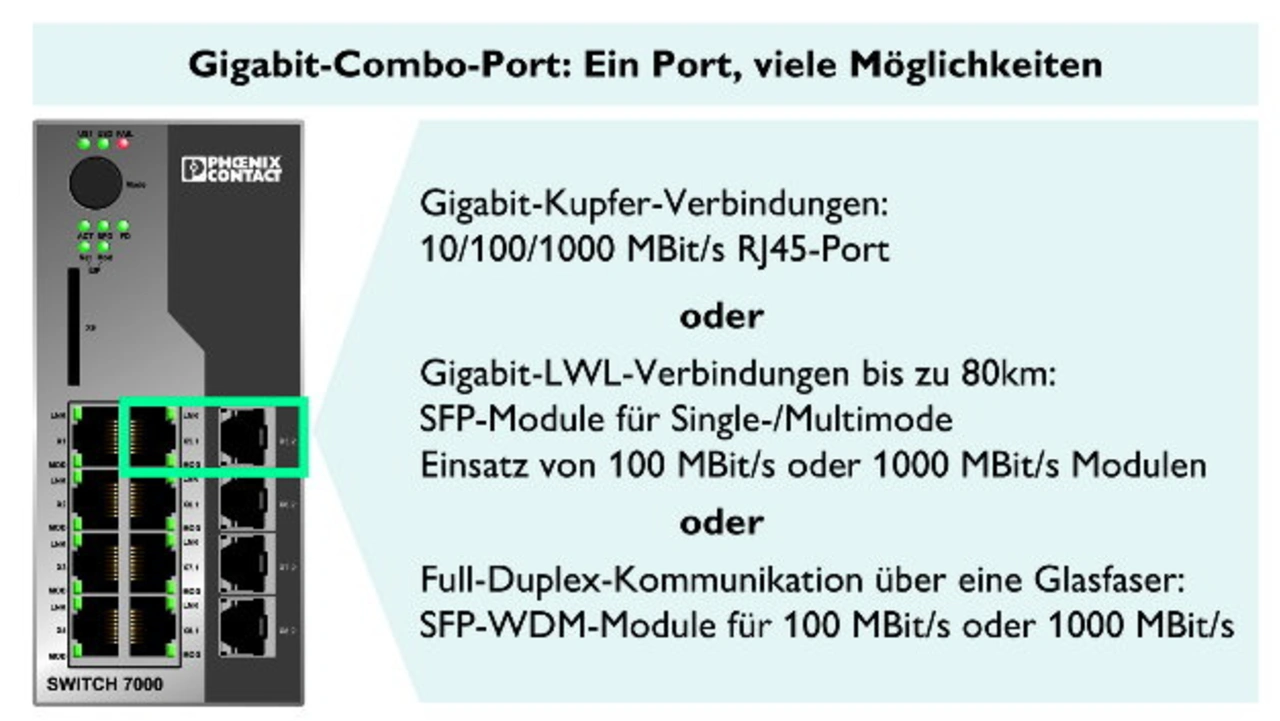 Die Combo-Ports bestehen jeweils aus einer korrespondierenden RJ45-Schnittstelle und einem SFP-Slot (Small Form-factor Pluggable). Sie lassen sich somit entweder für Kupfer- oder für Glasfaser-Verbindungen nutzen. Ist ein besonders hoher Datendurchsatz erforderlich, unterstützen die Combo-Ports zudem eine Gigabit-Kommunikation. Mit bis zu vier Gigabit-Combo-Ports eignen sich die „FL-Switch-7000“-Switches für unterschiedliche Anforderungen innerhalb einer Applikation. Weil Phoenix Contact eine große Auswahl von SFP-Glasfaser-Modulen bietet, sind mit einem Combo-Port Single- und Multimode-Verbindungen mit einer Leitungslänge von maximal 80 km umsetzbar. Gigabit- und Fast-Ethernet-SFP-Module, die in die SFP-Slots der Gigabit-Combo-Ports eingesteckt werden können, eröffnen zusätzliche Flexibilität (Bild 2).