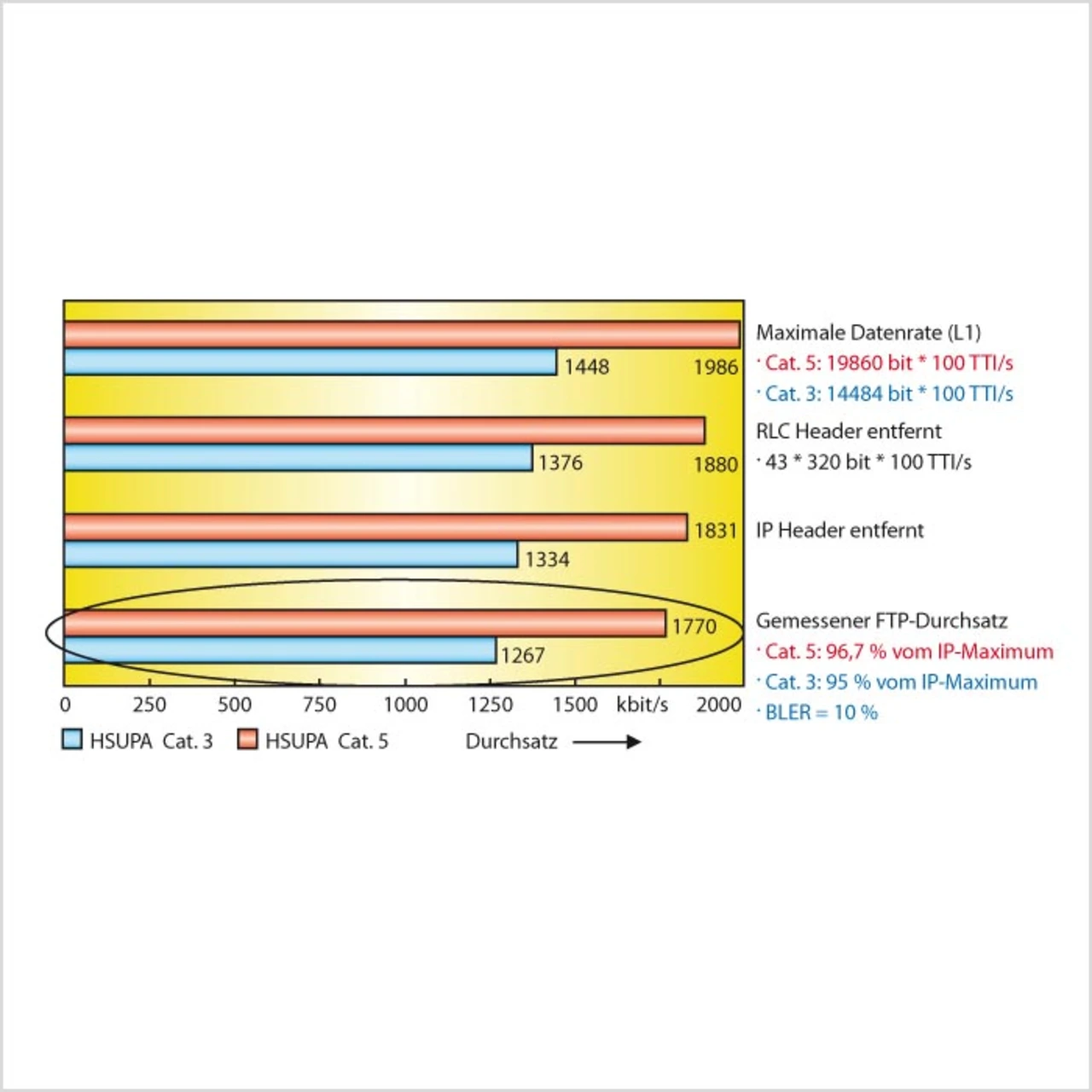 Zur Beurteilung eines gemessenen FTP-Durchsatzes wird zunächst betrachtet, was unter den gegebenen Bedingungen theoretisch maximal möglich wäre. Bild 3 zeigt am Beispiel eines Cat3- und Cat5-UEs, welche effektive Nutzdatenrate sich im Idealfall ergeben würde. Wird beispielsweise einem Cat3-UE eine maximale TBS-Blockgröße von 14 484 Bits auf der Luftschnittstelle (L1) erlaubt, bleiben nach Abzug von RLC- (Radio Link Control), IP- (Internet Protocol), Header- und Füllbits (Padding Bits) von der ursprünglichen Datenrate von ca. 1,45 Mbit/s noch eine Nutzdatenrate von ca. 1,3 Mbit/s übrig. Diese würde allerdings nur dann erreicht, wenn keine Daten wiederholt übertragen werden müssen, und zwar weder auf L1-, RLC- noch auf IP-Ebene. Wie man den gemessenen FTP-Durchsätzen in Bild 3 unten entnehmen kann, können in realen Systemen bei Blockfehlerraten von 10 % auf der Luftschnittstelle (HARQ BLER) dennoch ca. 96 % der theoretischen Grenze auf der IP-Ebene erreicht werden.