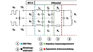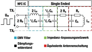 Ein NFC-IC hat normalerweise einen differenziellen Ausgang und eine Impedanz von 50 Ω zwischen den Ausgangsanschlüssen TX1 und TX2 (Bild 4). Diese Anschlüsse sind mit einer Schaltung verbunden, die aus einem Filternetzwerk, einer Anpassungsschaltung, Dämpfungswiderständen und einer NFC-Antenne besteht. Der Ausgang des NFC-ICs ist differenziell, um gegen elektromagnetische Störsignale resistent zu sein. Eine typische differenzielle NFC-Ausgangsschaltung ist in Bild 4 dargestellt.