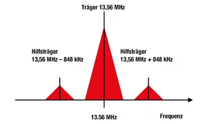 Die Grenzfrequenz fC muss höher sein als der obere Hilfsträger, der für die höchstmögliche NFC-Datenrate (848 kbit/s) 13,56 MHz + 848 kHz = 14,4 MHz beträgt. Zur Veranschaulichung der Notwendigkeit des Filters ist in Bild 6 ein NFC-Lastmodulationsspektrum mit Träger und Hilfsträgern dargestellt