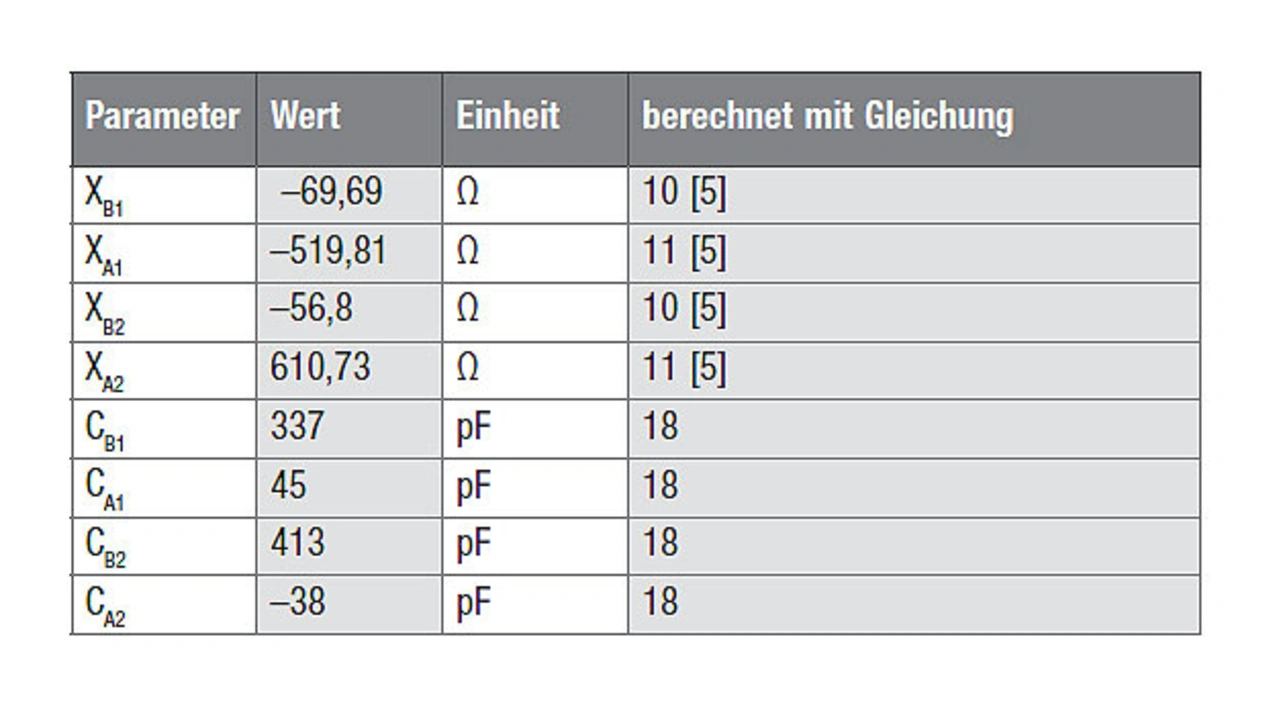 Tabelle 2 gibt einen Überblick über die resultierenden Reaktanz- und Kapazitätswerte. Die Kondensatorwerte für CA1 und CB1 werden für die Anpassung verwendet, die Werte für CA2 und CB2 werden vernachlässigt, da CA2 einen negativen Wert ergibt. Daraus ergeben sich die Anpassungskondensatoren für die symmetrische Ausgangsschaltung zu: