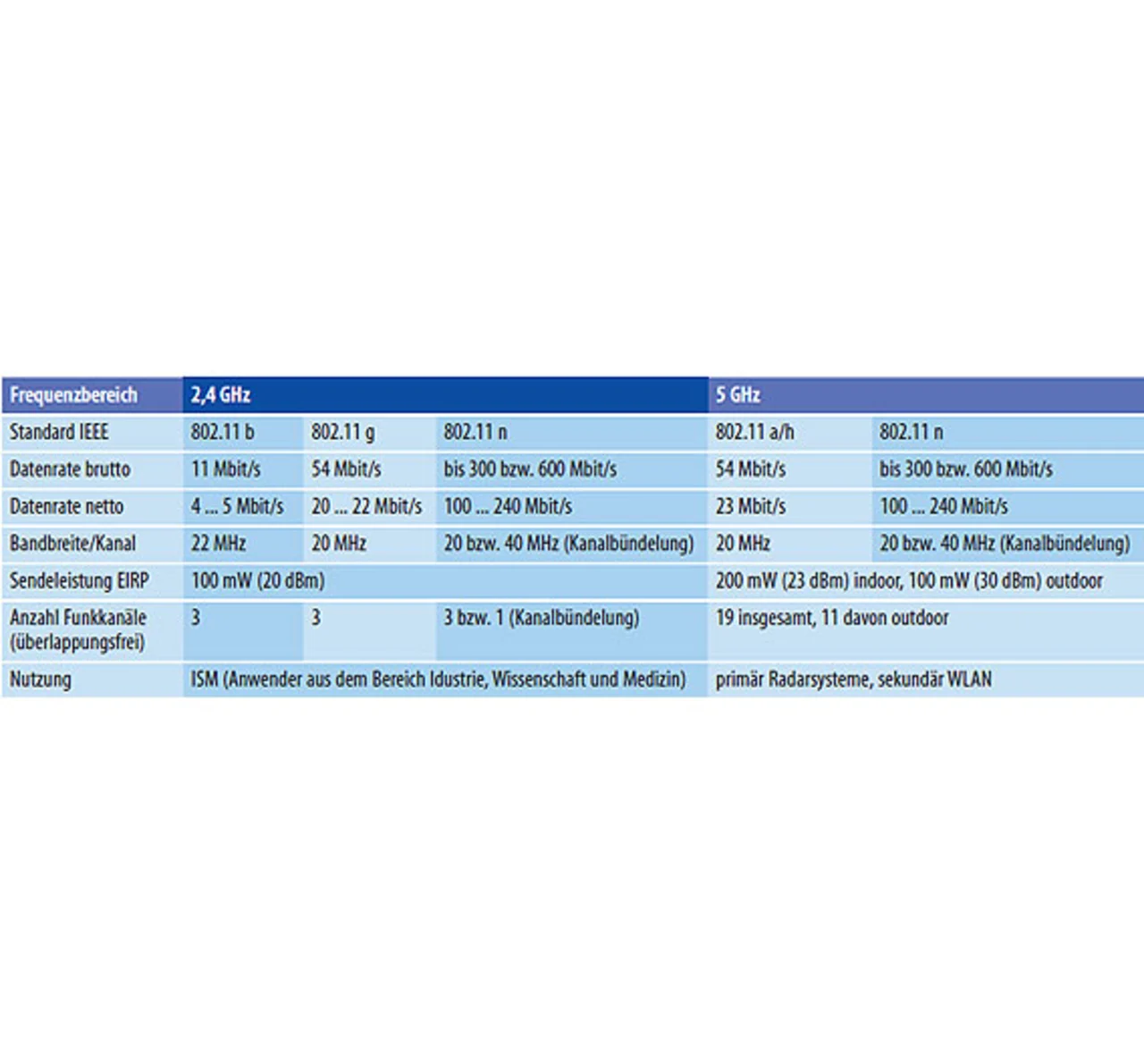 Die Erhöhung der Datenrate von 54 Mbit/s (IEEE 802.11 a/g) auf mehr als 300 Mbit/s wird meist mit IEEE 802.11n in Verbindung gebracht (Tabelle). Eine solch hohe Übertragungsgeschwindigkeit ist in Automatisierungsanwen- dungen von nachrangiger Bedeutung. Als wichtiger erachten die Anwender eine weitere Steigerung der Zuverlässigkeit. Zu diesem Zweck ergänzen die aktuellen WLAN-Chips die MIMO-Technik um das Space Time Block Coding (STBC).