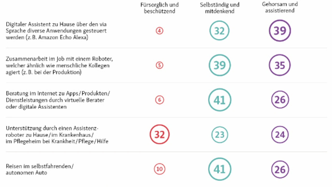 Es gibt starke Unterschiede, wie sich die Geräte nach Meinung der Befragten verhalten sollen: Beim Einsatz von Pflegerobotern ist ein empathisches, fürsorgliches und beschützendes Verhalten erwünscht. Bei anderen Geräten, wie etwa Sprachassistenten oder Robotern im Job, herrscht größere Uneinigkeit, ob die Maschinen sich eher »selbständig / mitdenkend« oder »gehorsam / assistierend« verhalten sollen. »Die Verbreitung intelligenter Geräte stellt unsere Gemeinschaft vor ganz neue Fragen. Die Studie zeigt, dass sich die Menschen noch uneins beim Umgang mit diesen Fragen sind. Daher ist es notwendig, dass wir eine gesellschaftliche Debatte über ethische Leitplanken für die zunehmend digitalisierte Welt führen und moralische Fragen gemeinsam beantworten«, fordert Schwaderer.